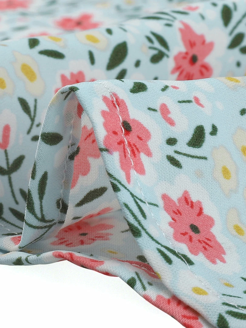 - Floral Print, V-Neck, Ruffle Front, Ruffle Elastic Cuff, Short Puff Sleeve, A-Line, Fit And Flare.