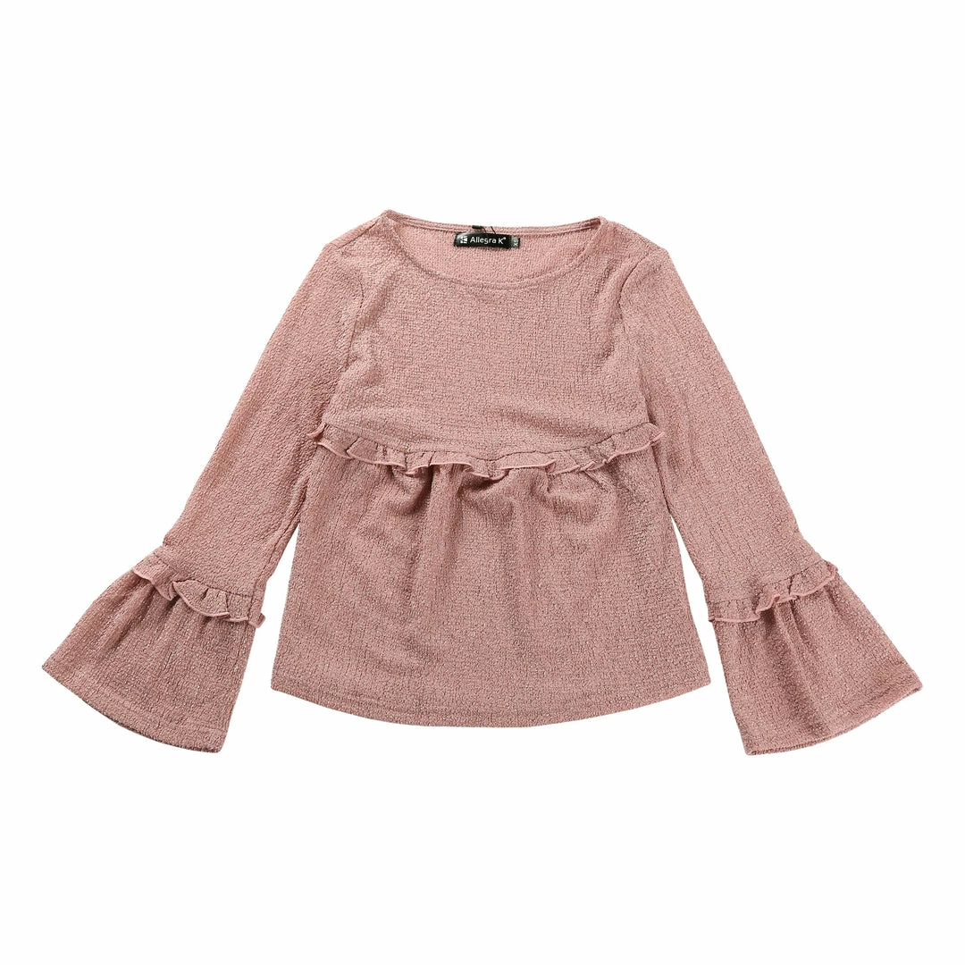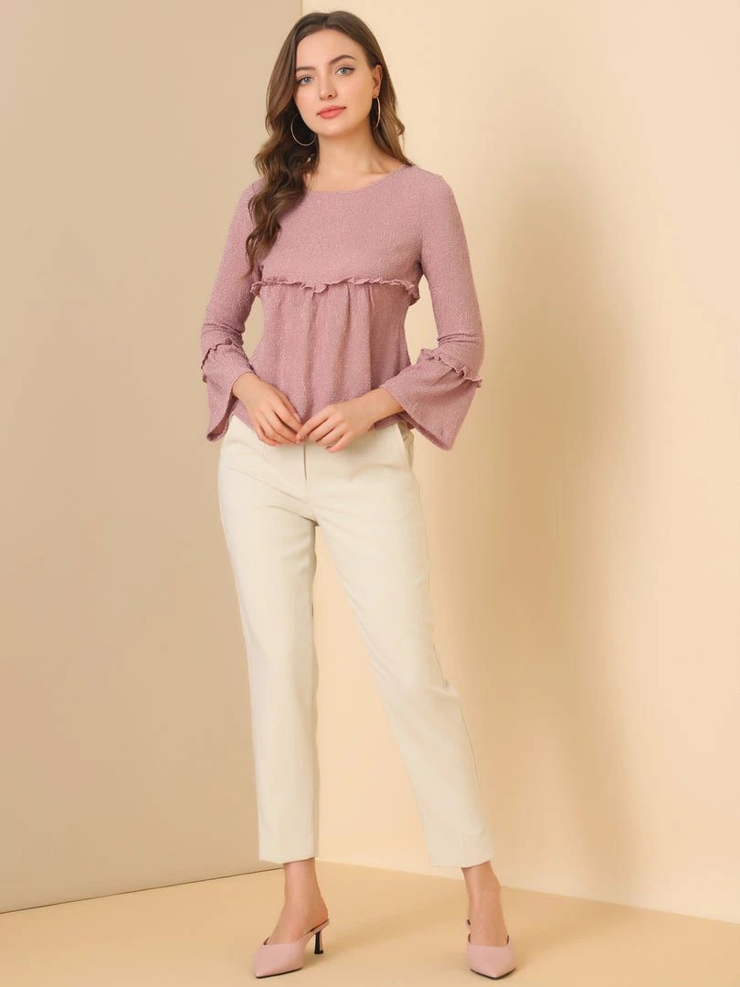 Allegra K Women’s Ruffle Hem Top Textured Round Neck High Waist Bell Long Sleeve Blouse