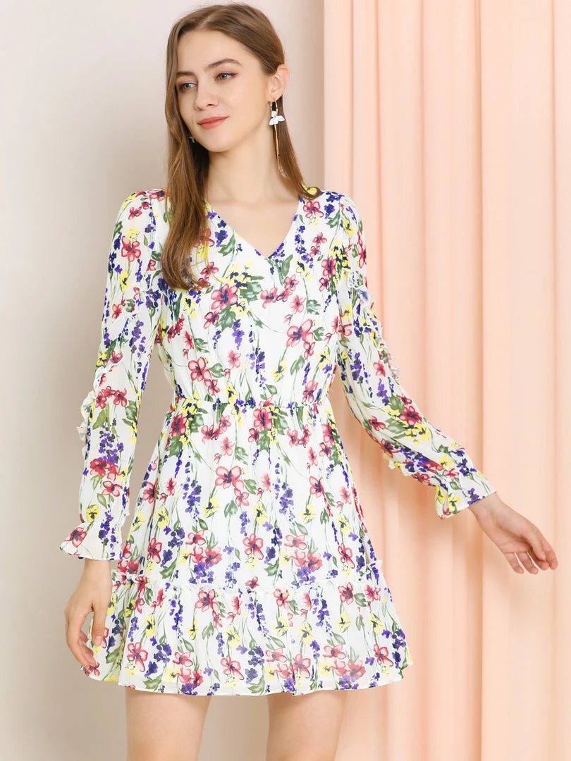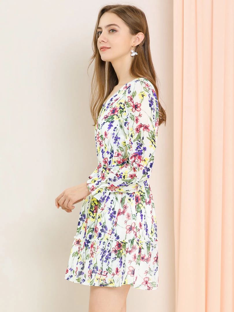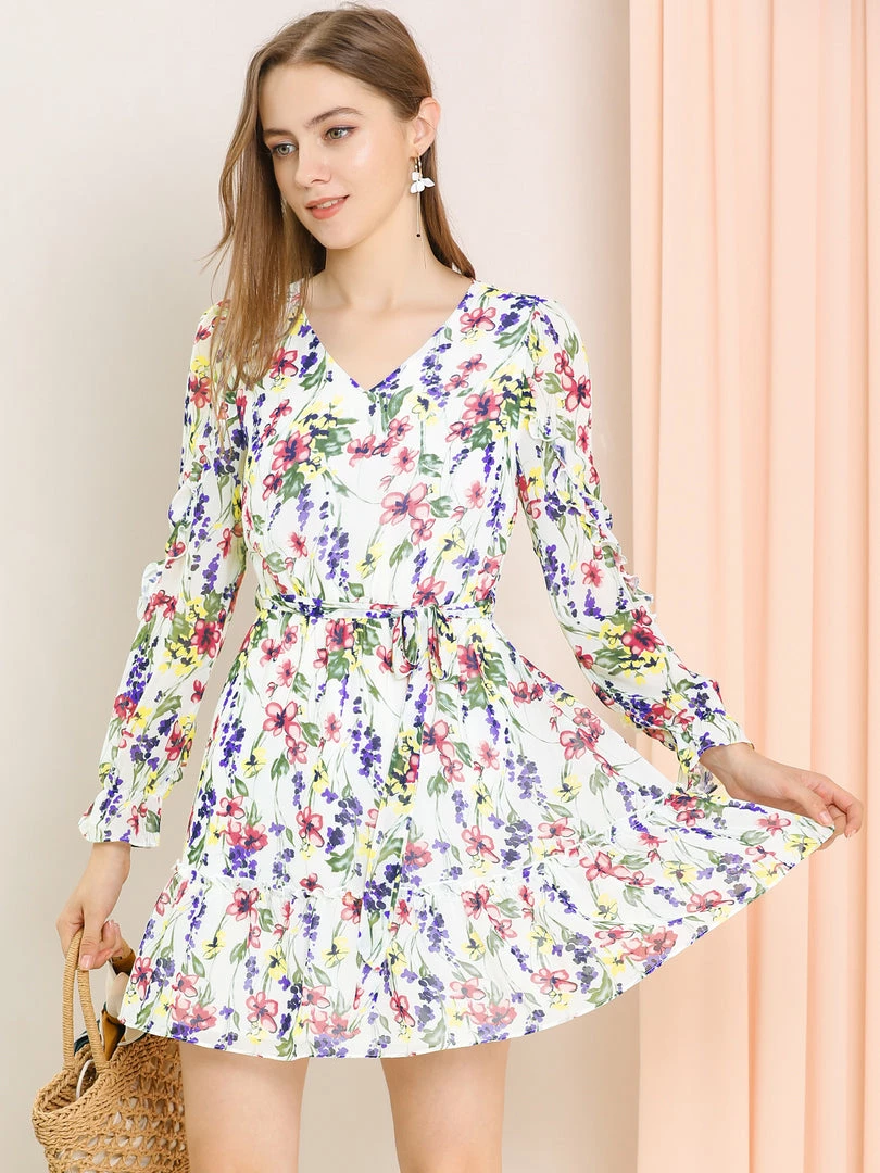 Allegra K Women’s Ruffle Hem V Neck Long Sleeve A-line Floral Dress With Belt