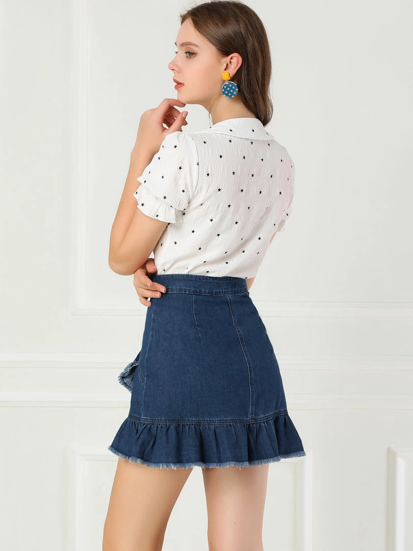 Allegra K Women’s Ruffle High Low Hem Button Front Mini Jeans Denim Skirt