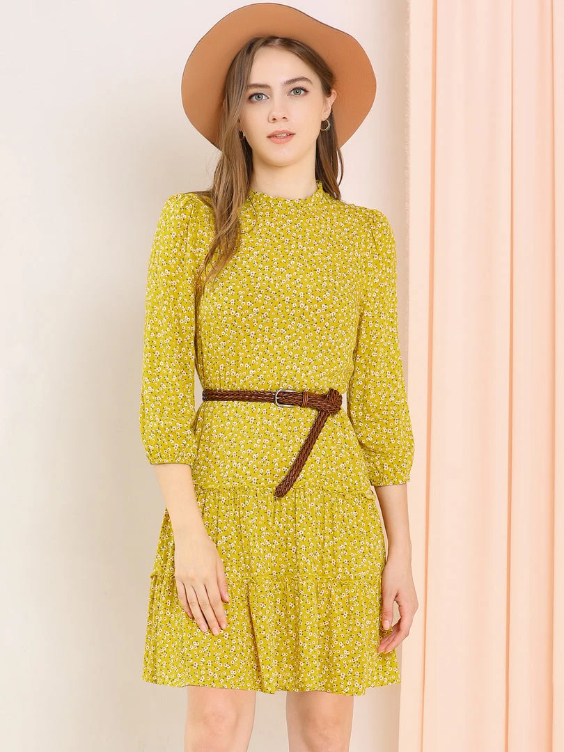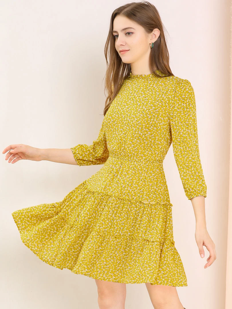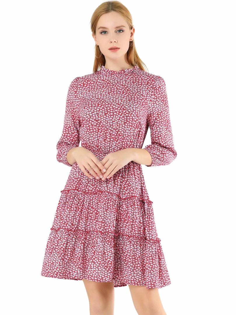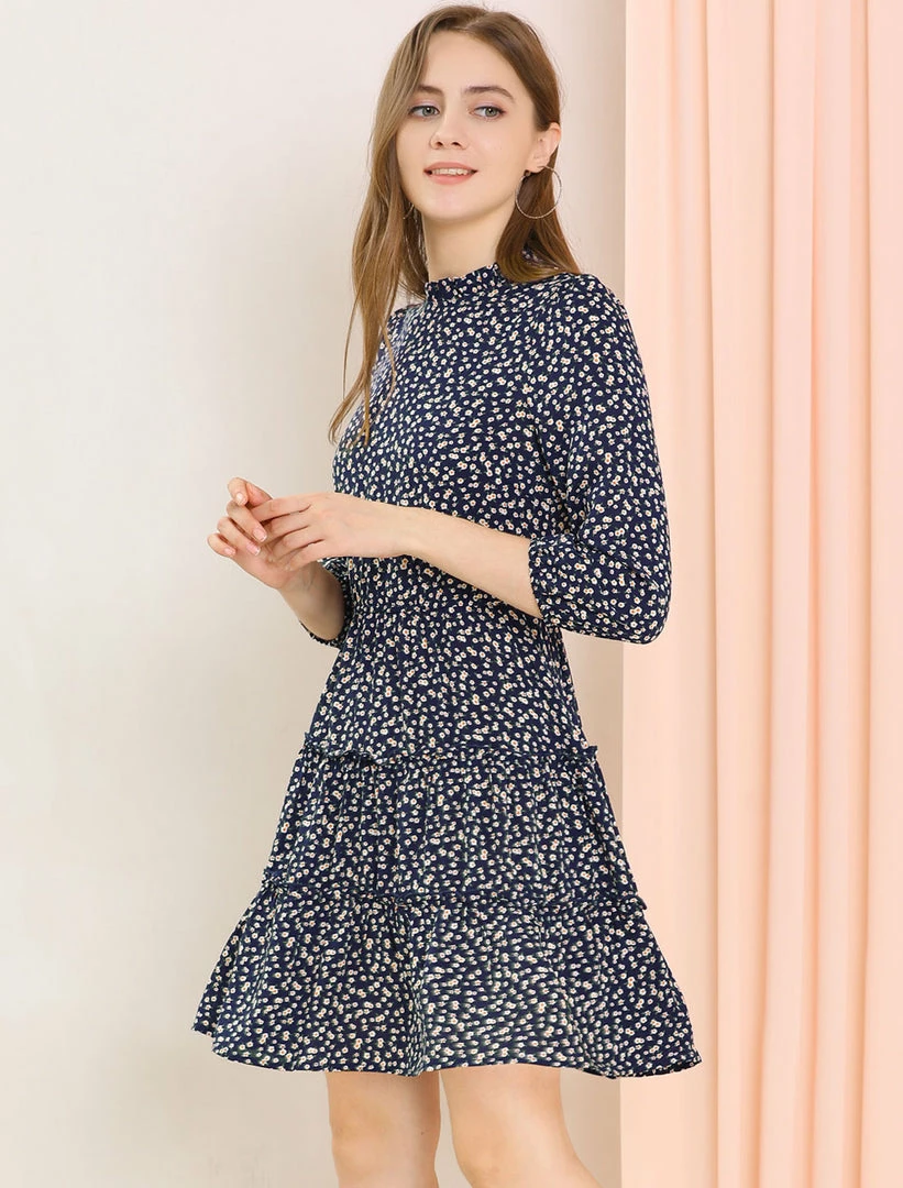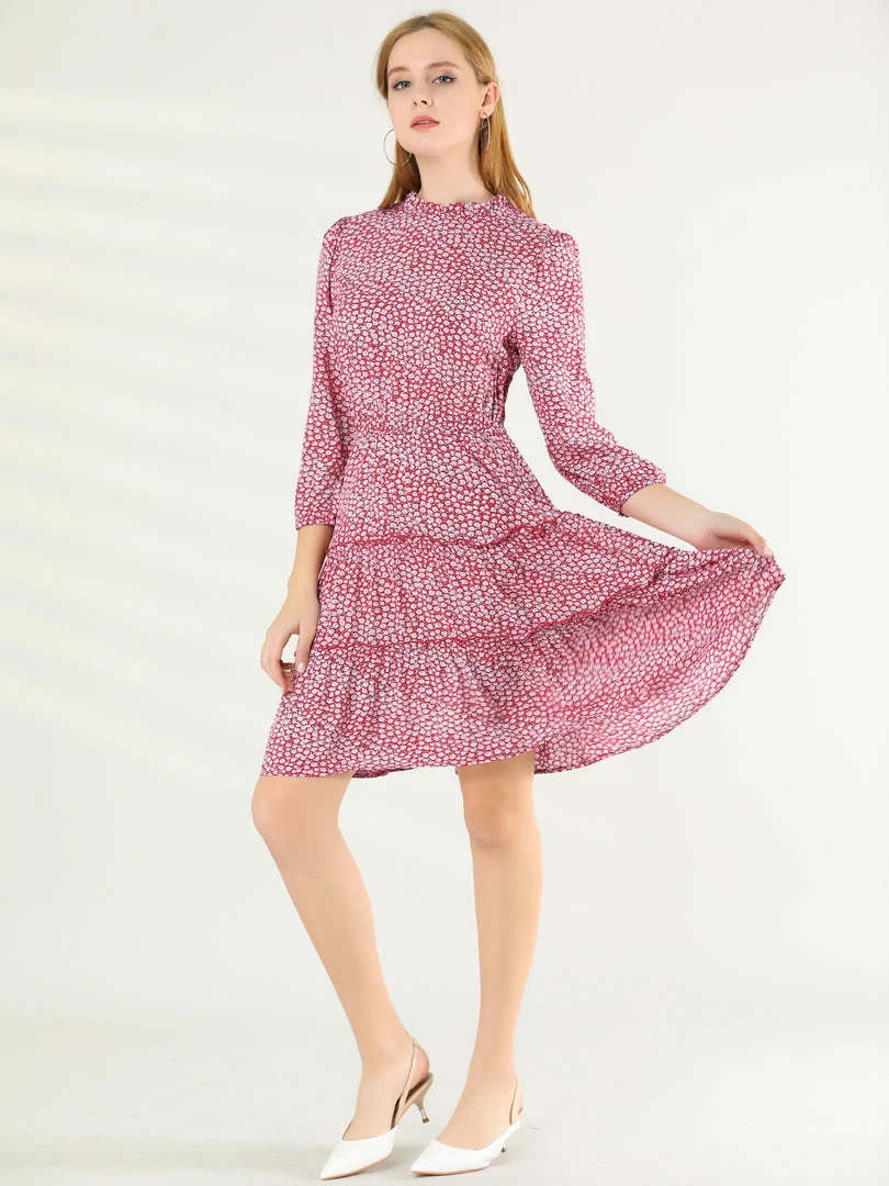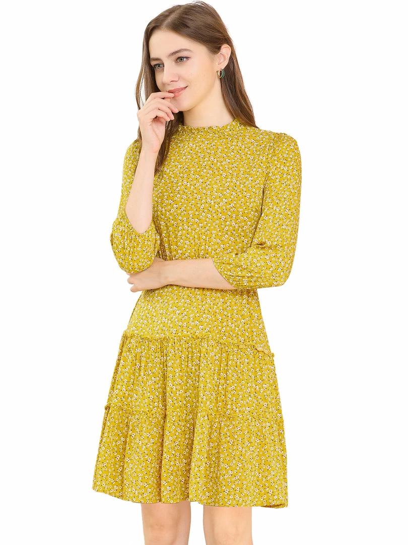 Allegra K Women’s Ruffle Neck 3/4 Sleeve A-Line Vintage Floral Tiered Dress