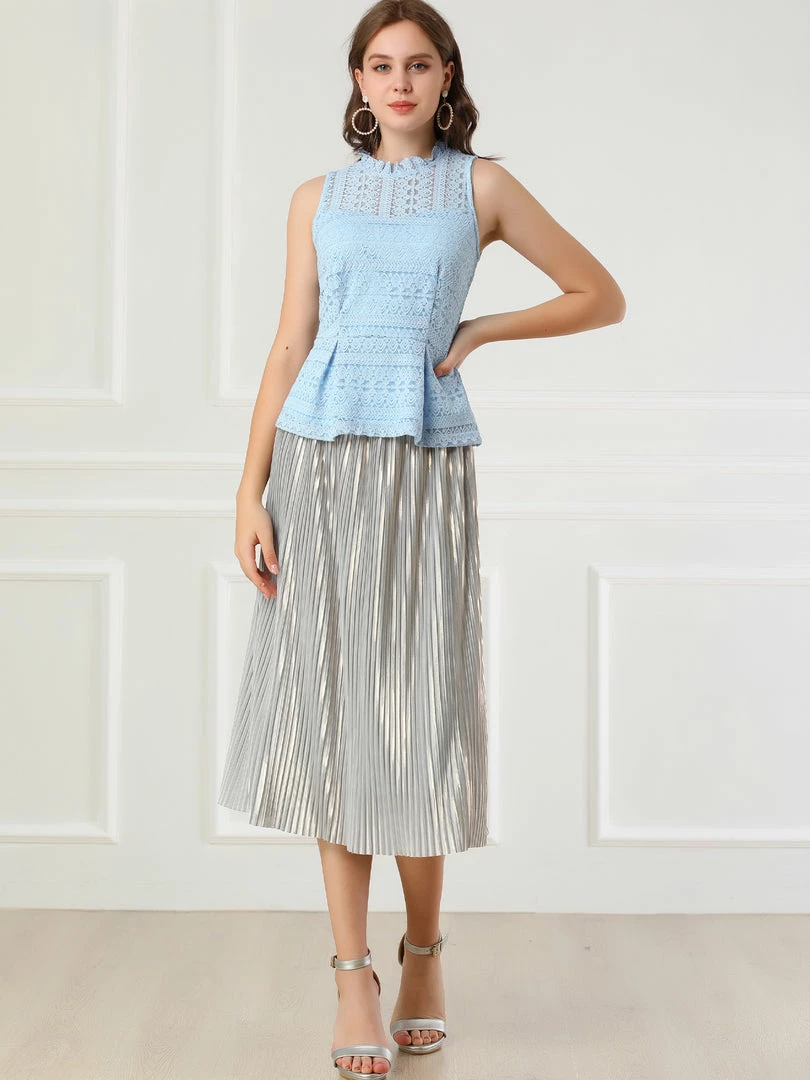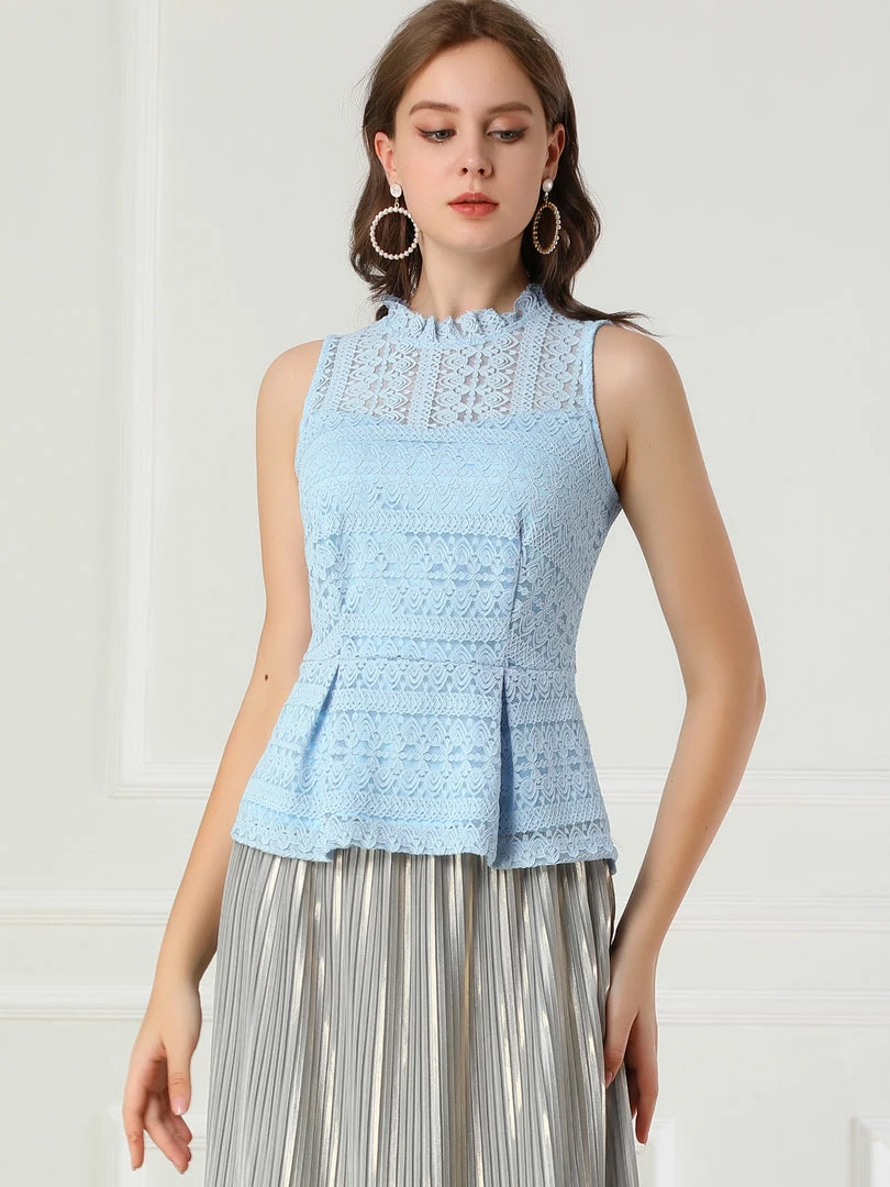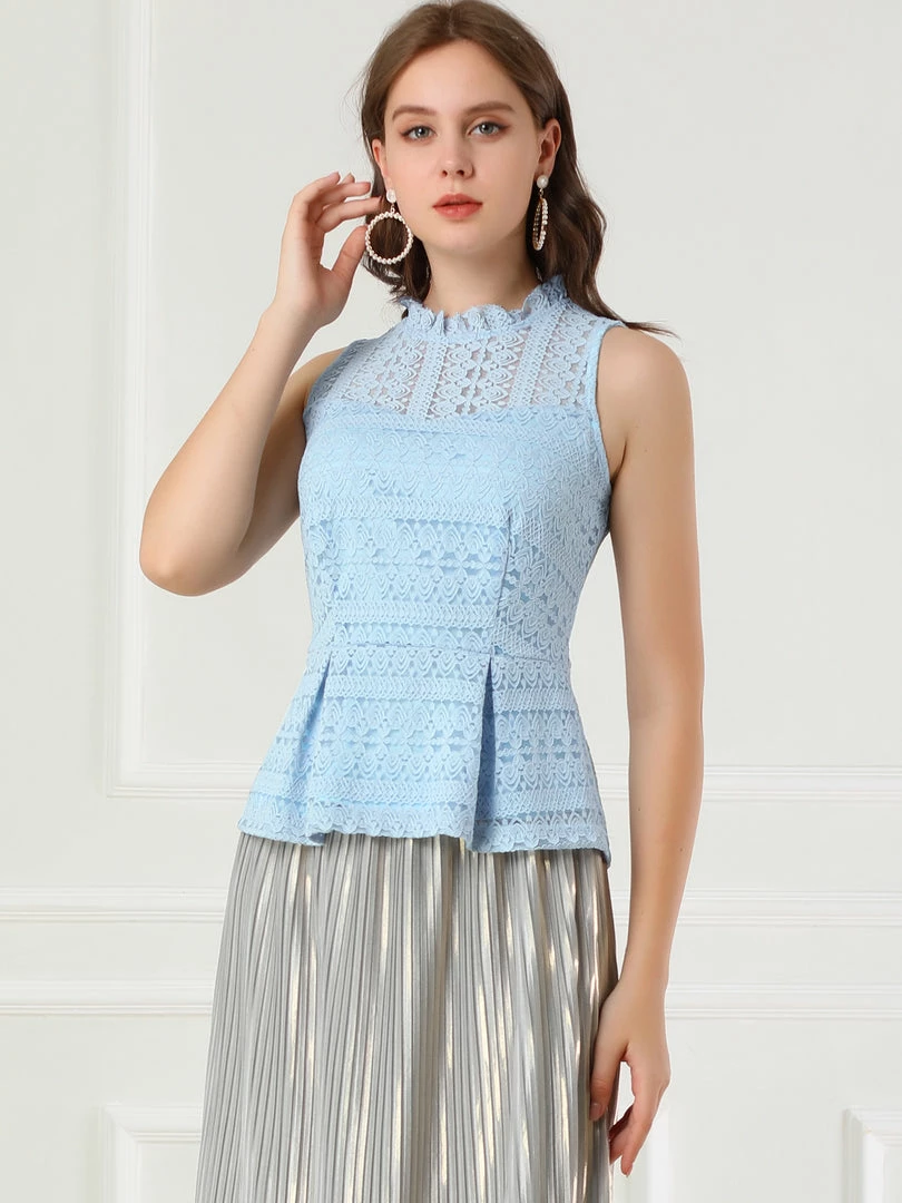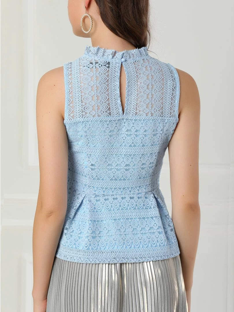 Allegra K Women’s Ruffle Neck Keyhole Back Sleeveless Floral Lace Peplum Top