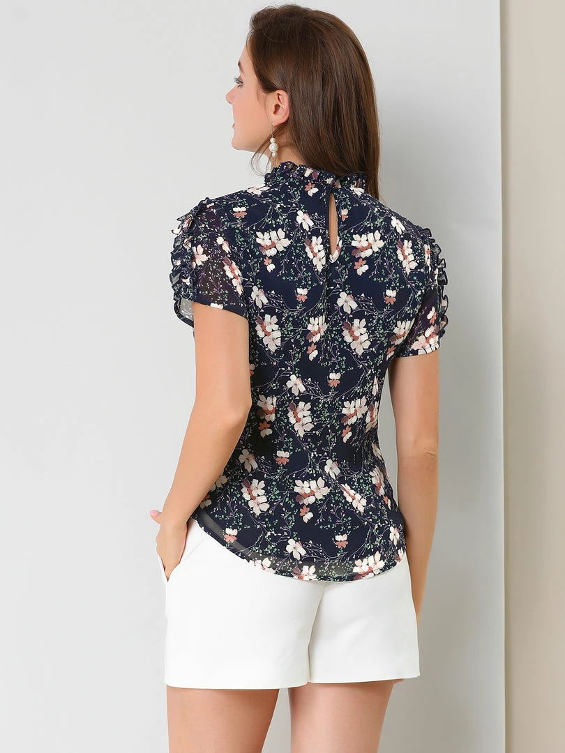 Allegra K Women’s Ruffle Neck Tops Frill Trim Short Sleeve Chiffon Floral Print Blouse