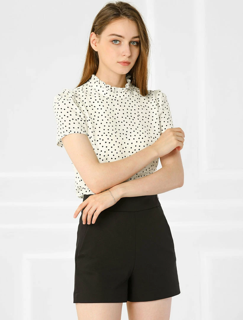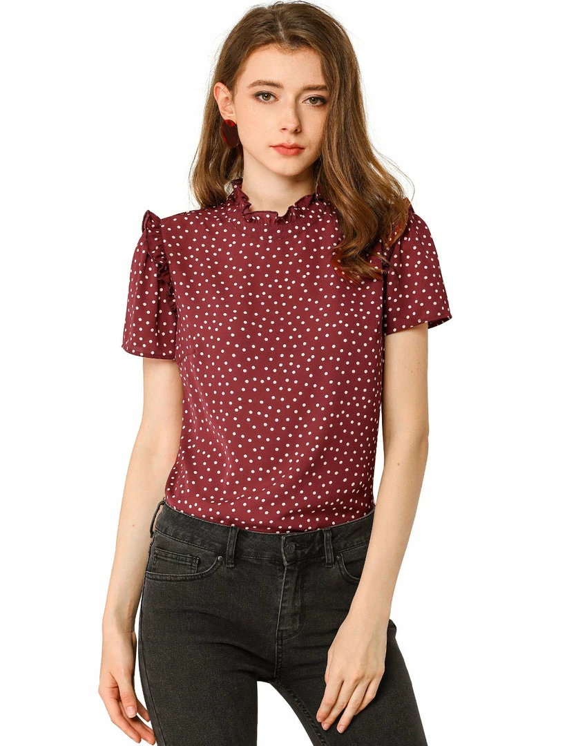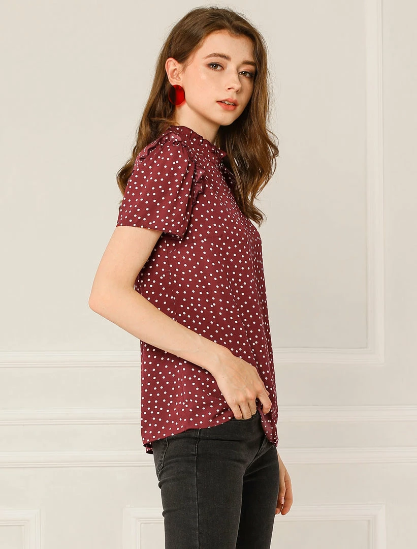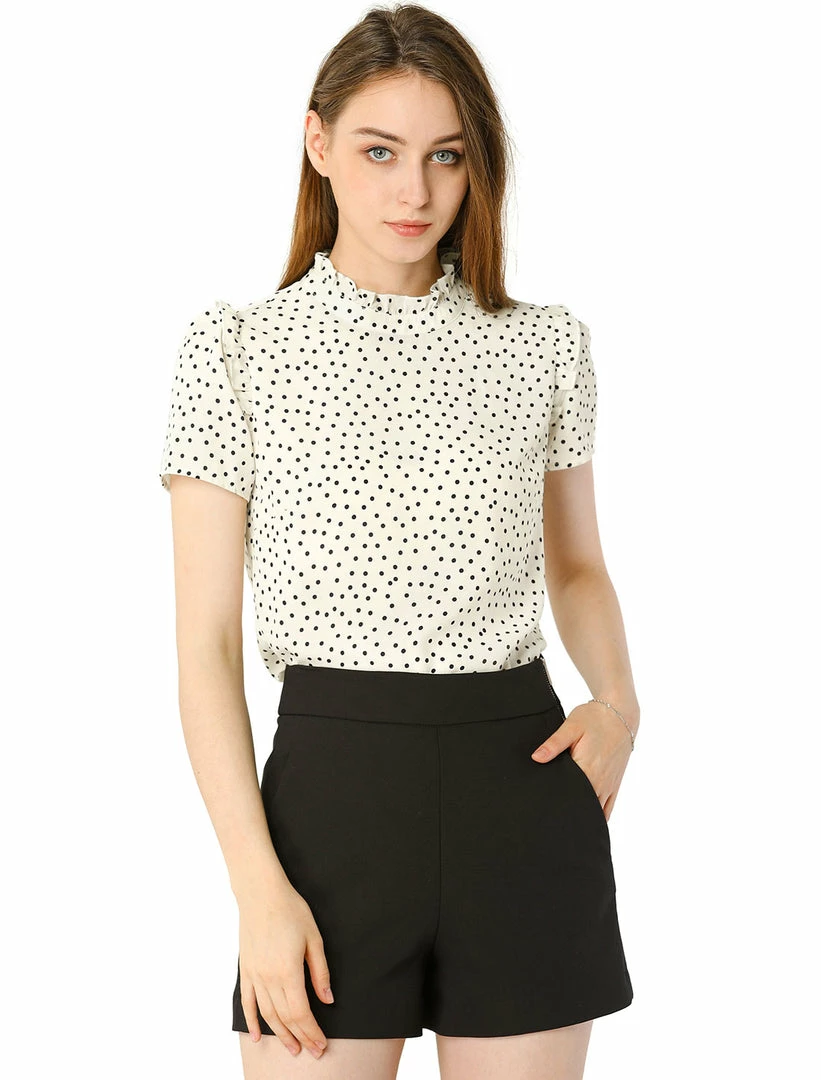 Allegra K Women’s Ruffle Polkd Dots Stand Collar Short Sleeve Blouse Tops