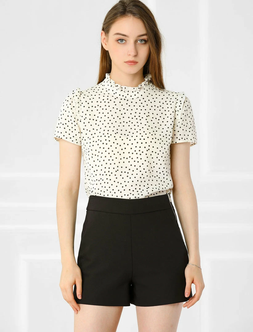 - Elegant dots lend charming flair to our blouse styled with stand collar, ruffled trim, short sleeves with frill, lightweight fabric.