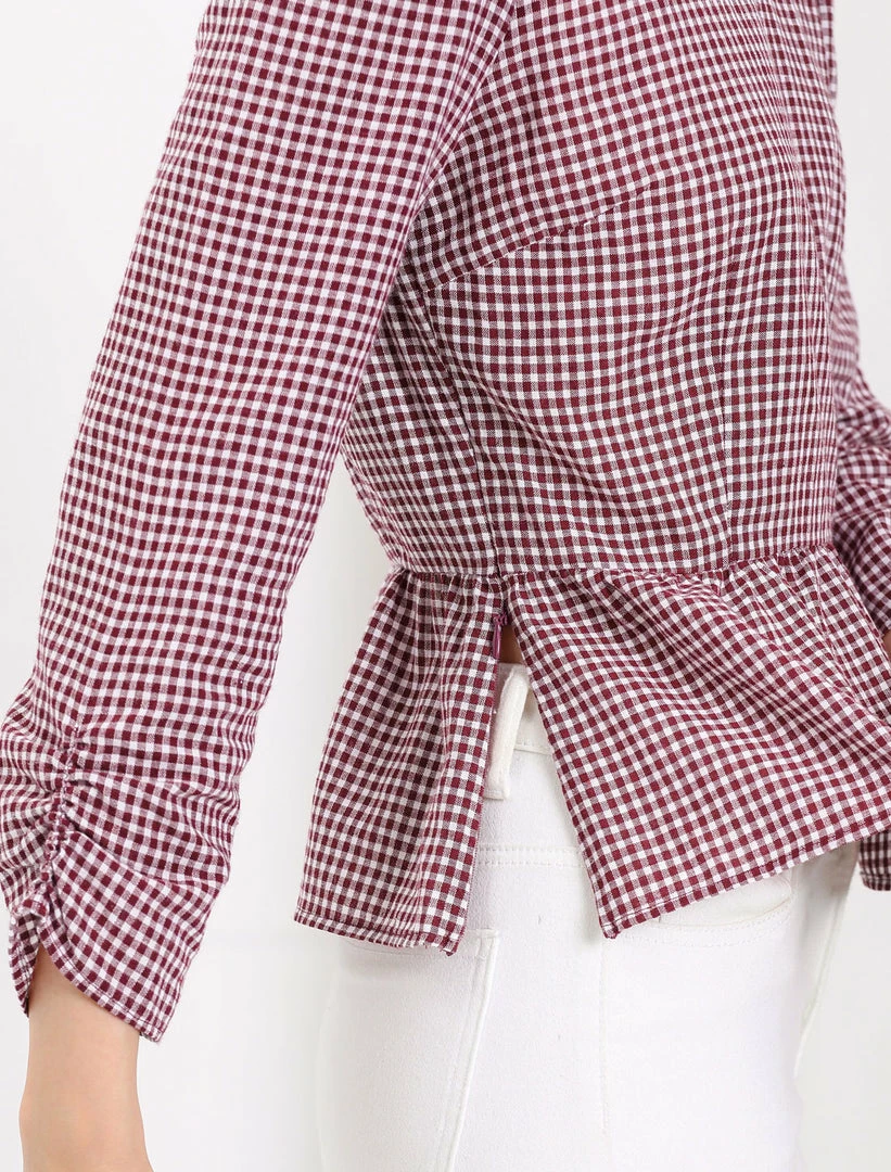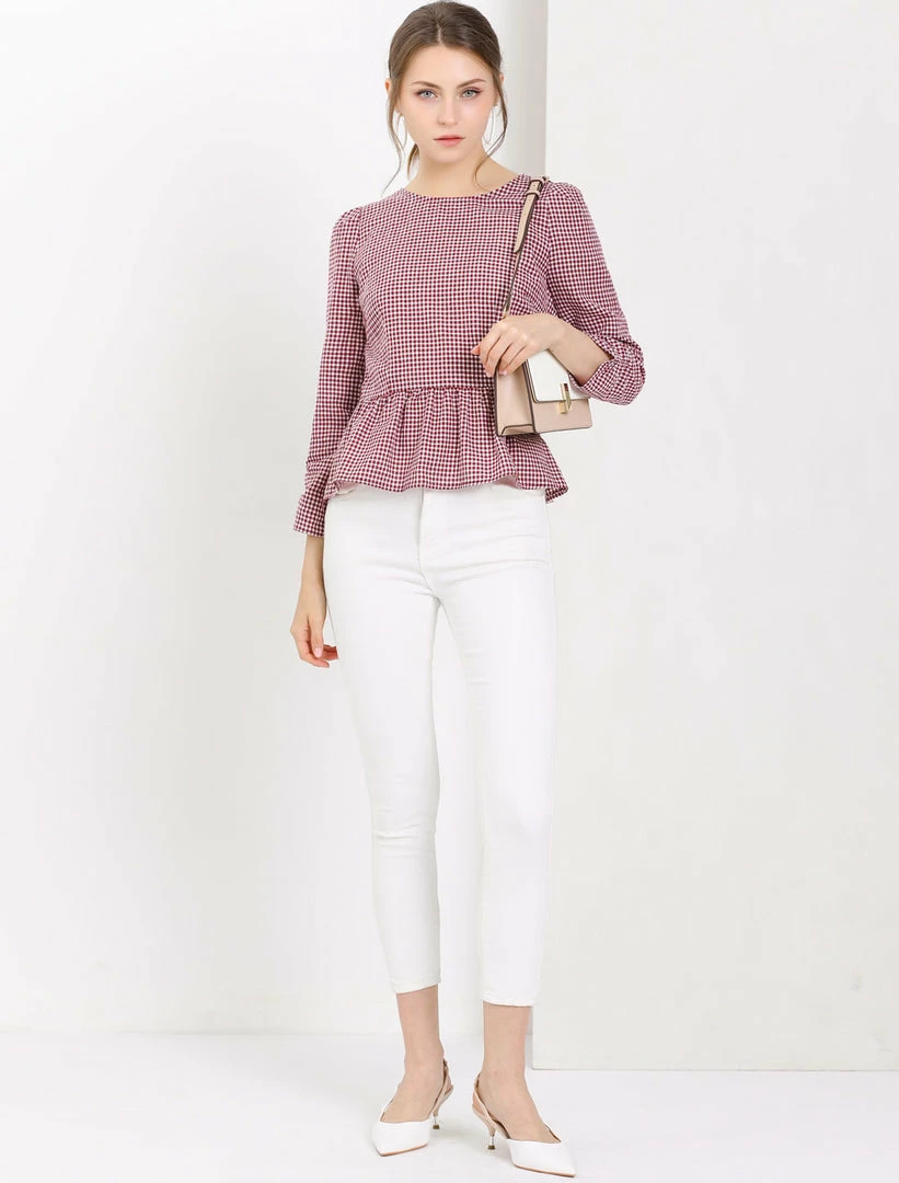 • Ruffle Hem, Gingham Print, 3/4 Puff Sleeves, Round Neckline, Invisible Side Zipper, Button Closure, Keyhole Back, Regular Fit.