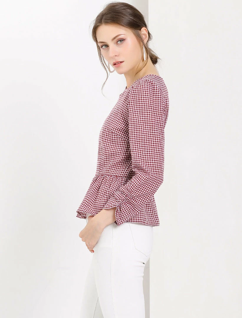 Allegra K Women’s Ruffle Puff Sleeve Round Neck Gingham Printed Button Zipper Crop Top Blouse