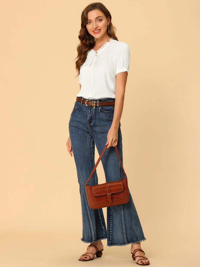 Allegra K Women’s Ruffle Self Tie Neck Button Up Puff Sleeve Blouse