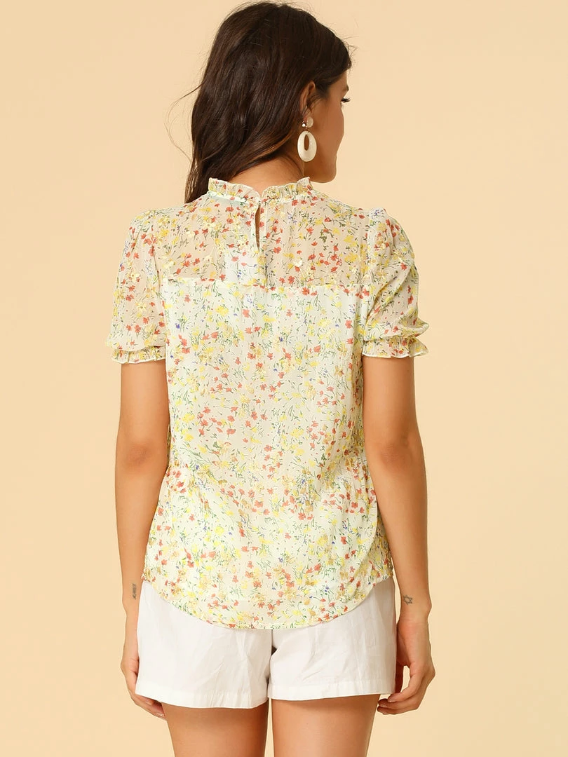 Allegra K Women’s Ruffle Stand Collar Short Sleeve Ditsy Floral Blouse Top