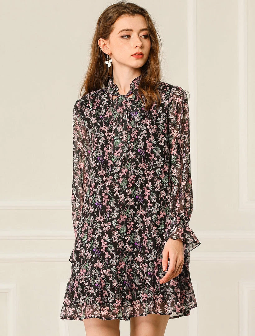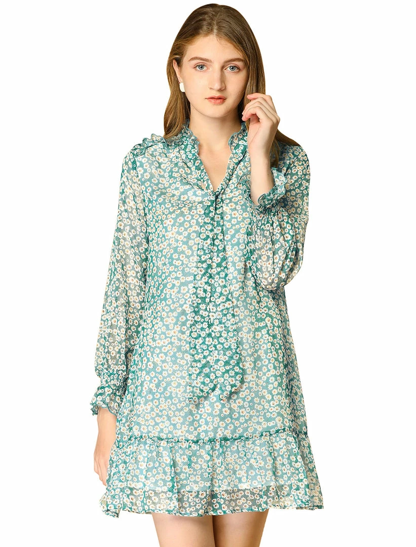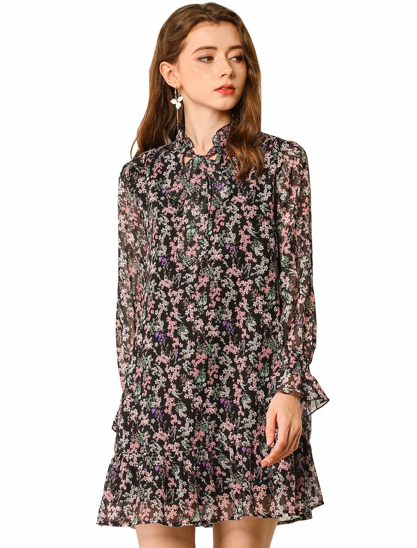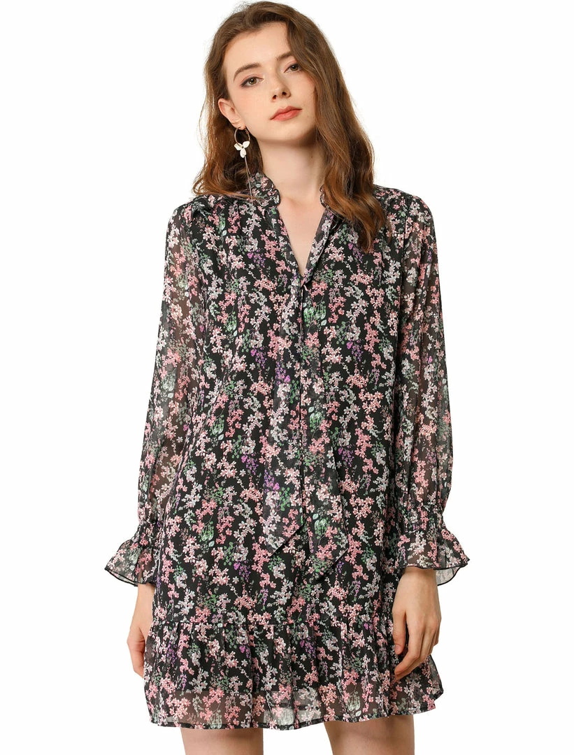 Allegra K Women’s Ruffle Tie Neck Loose Shift Floral Dress