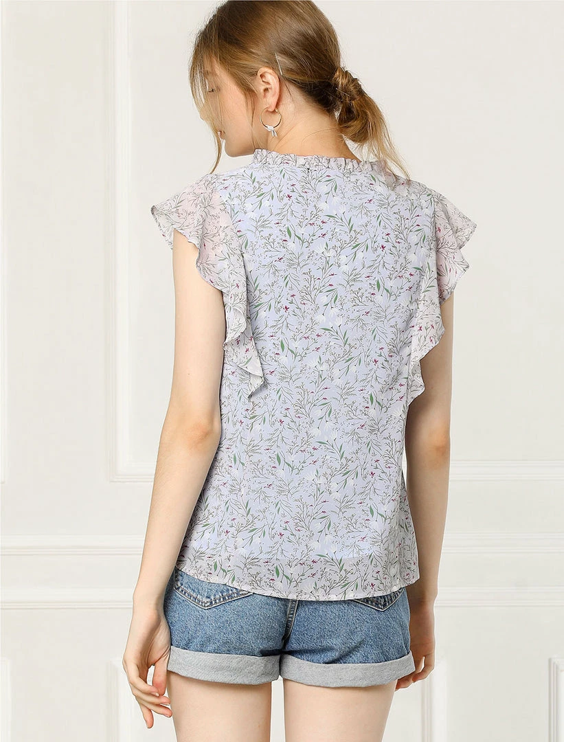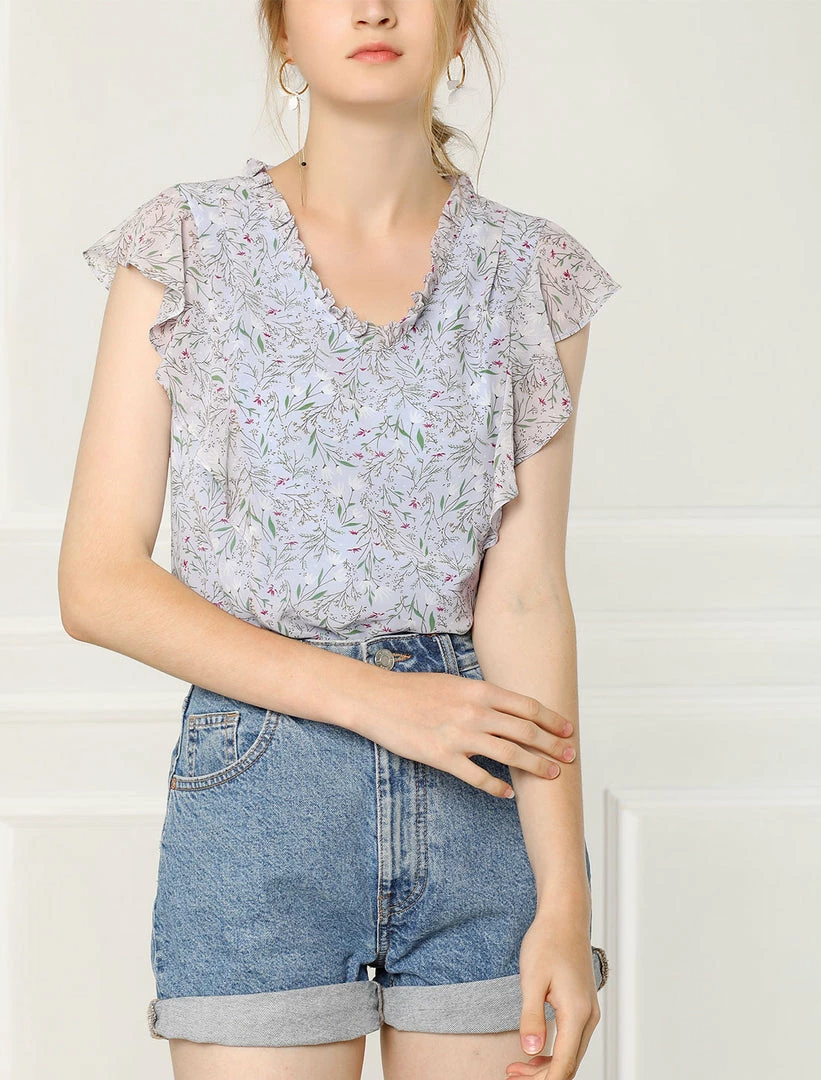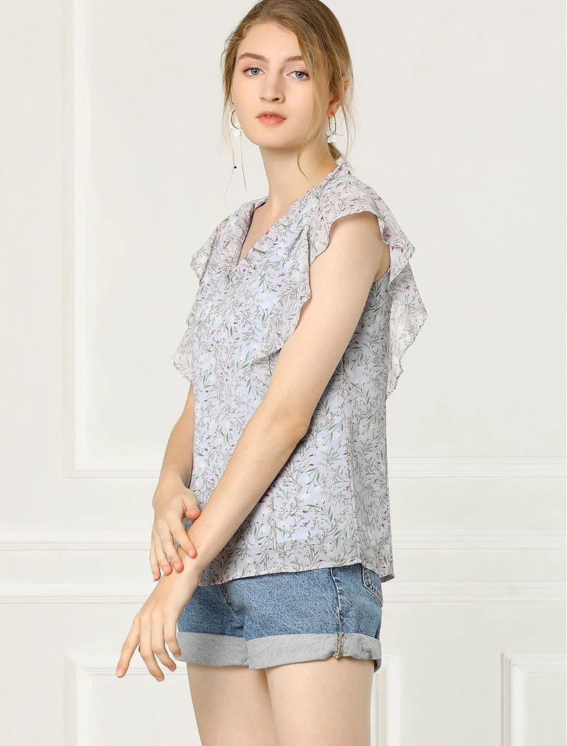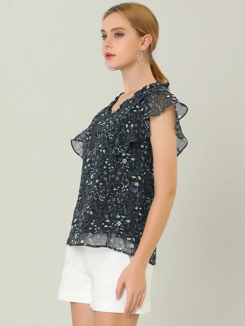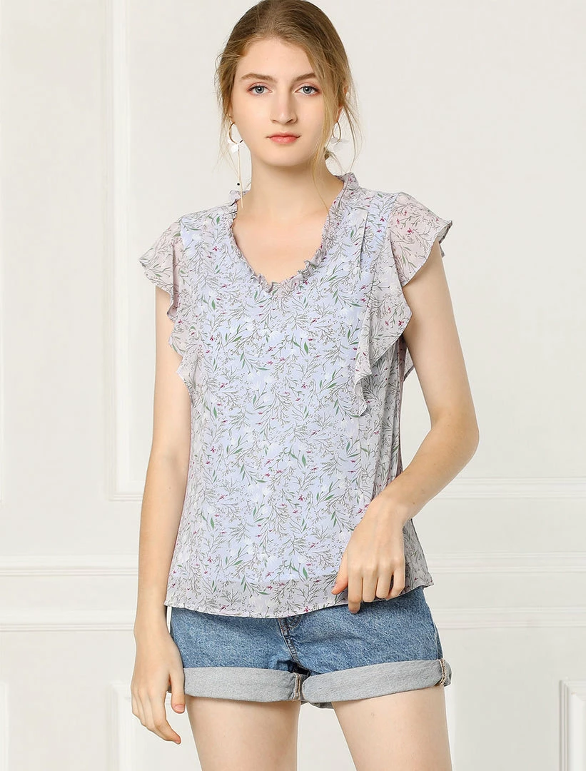 Allegra K Women’s Ruffle Tops Casual V Neck Cap Sleeves Floral Blouse
