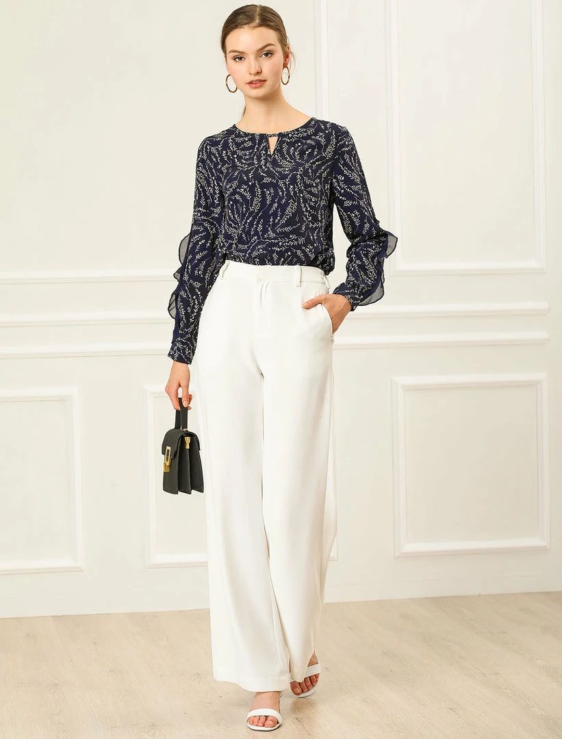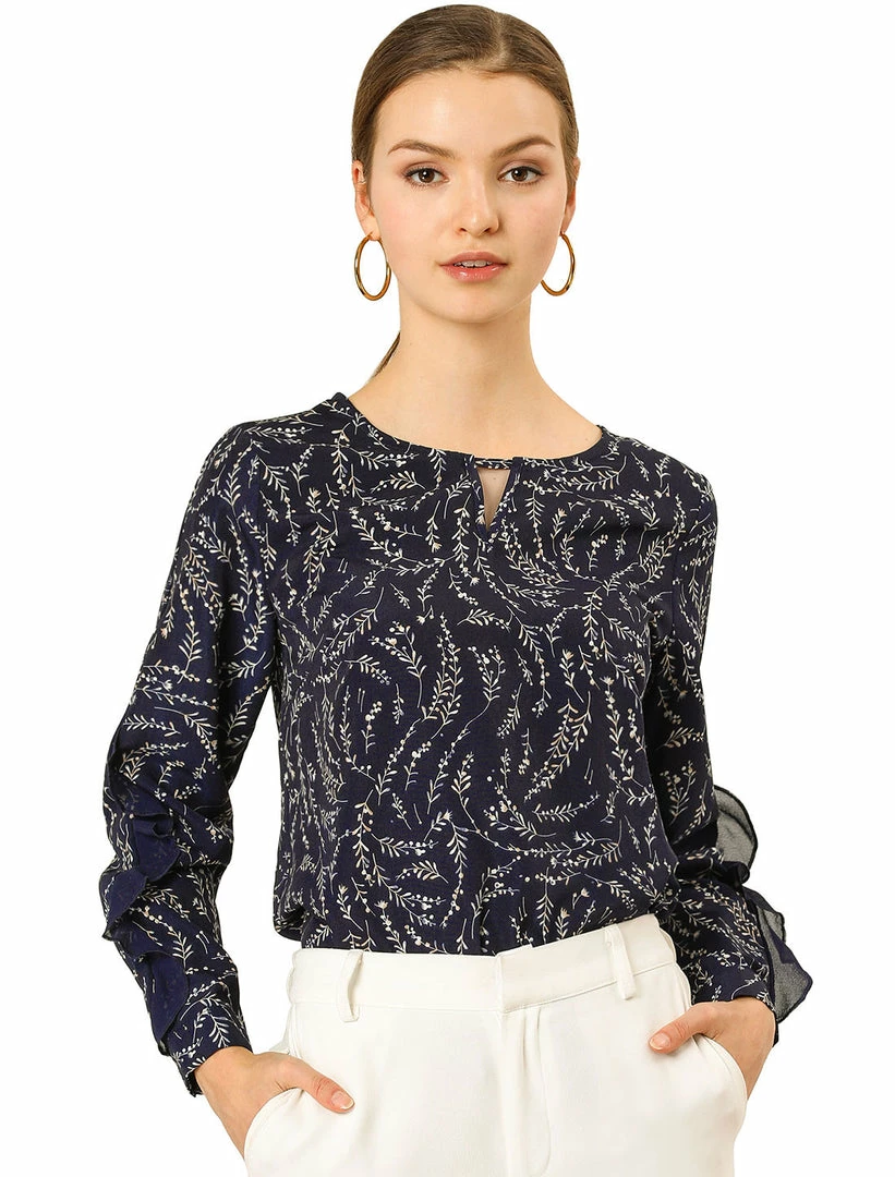 Allegra K Women’s Ruffle Trim Long Sleeve Vintage Tops Keyhole Neck Floral Blouse