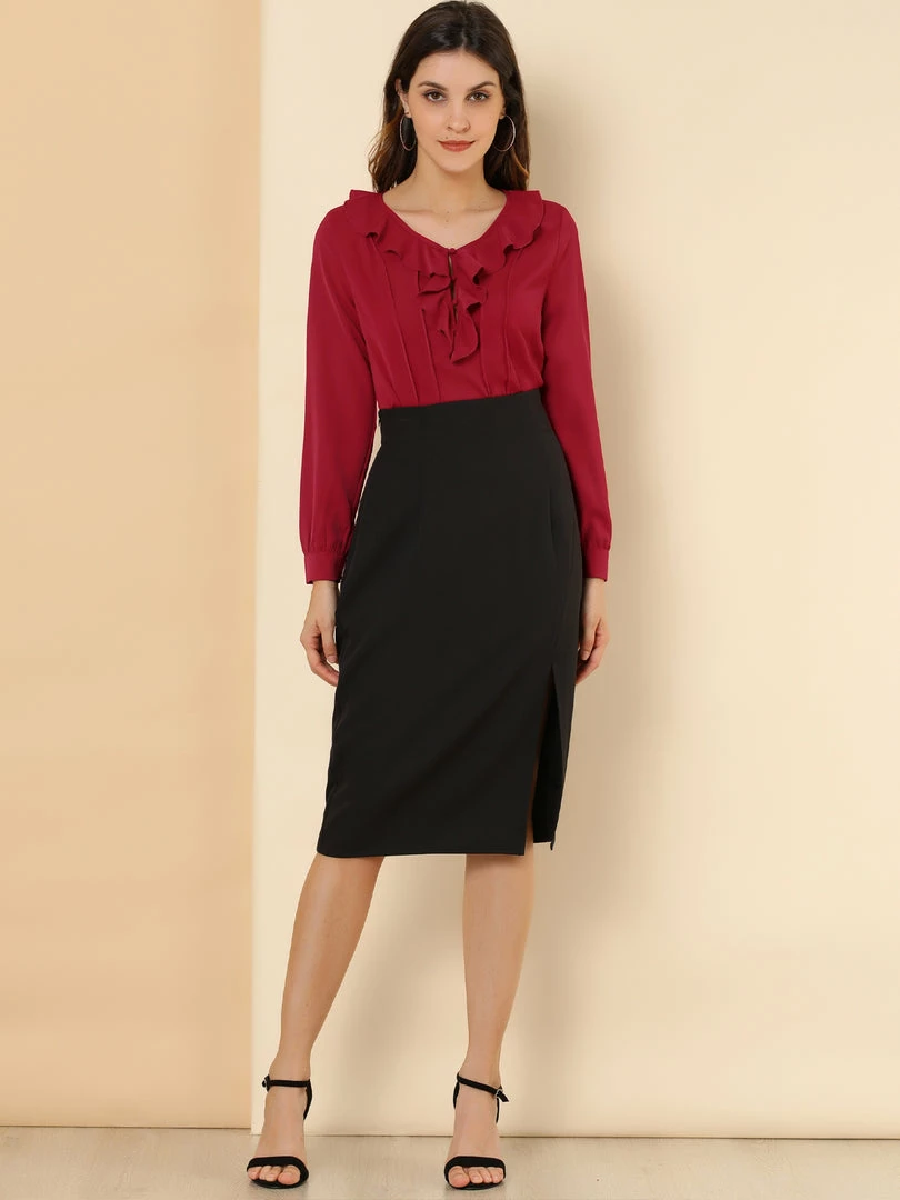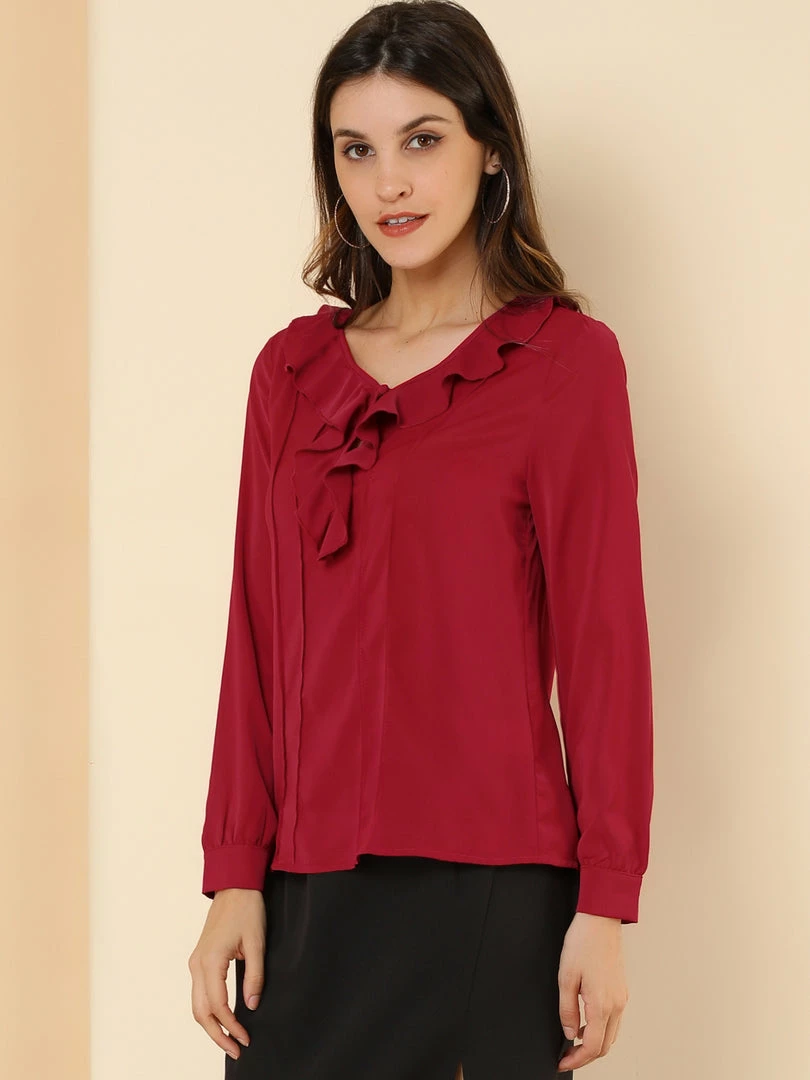 Allegra K Women’s Ruffle V Neck Chiffon Blouse For Office Work Pleated Vintage Shirt