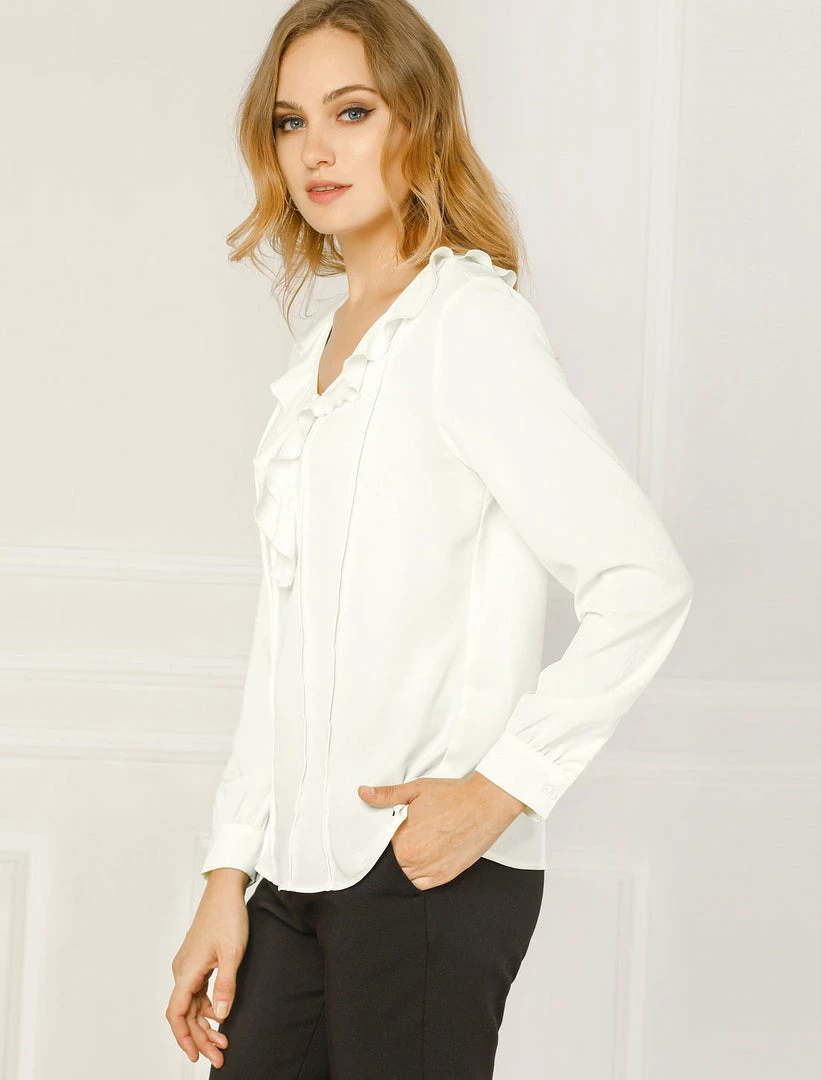 - This updated the plain blouse features an on-trend ruffle front design completed with a V-neck and covered button detailing.