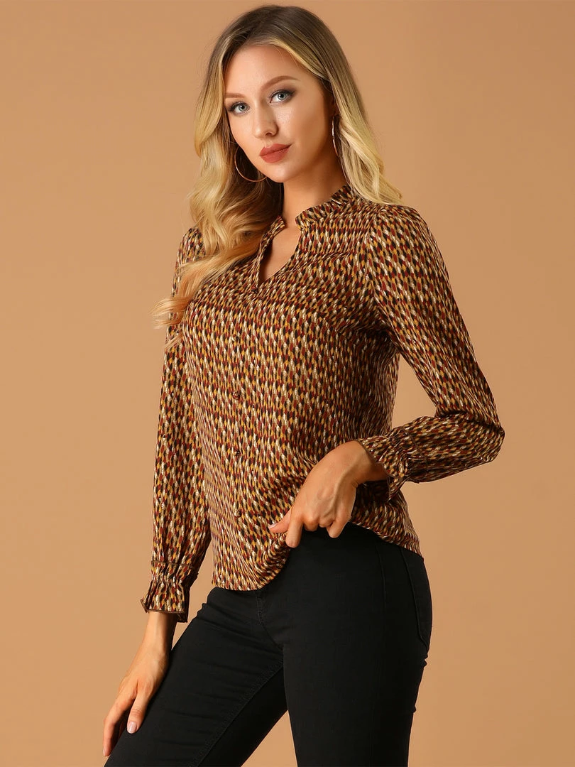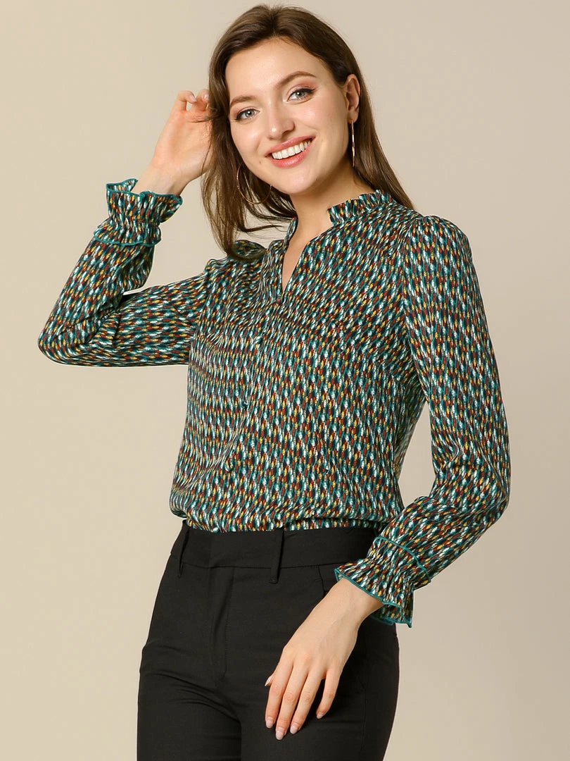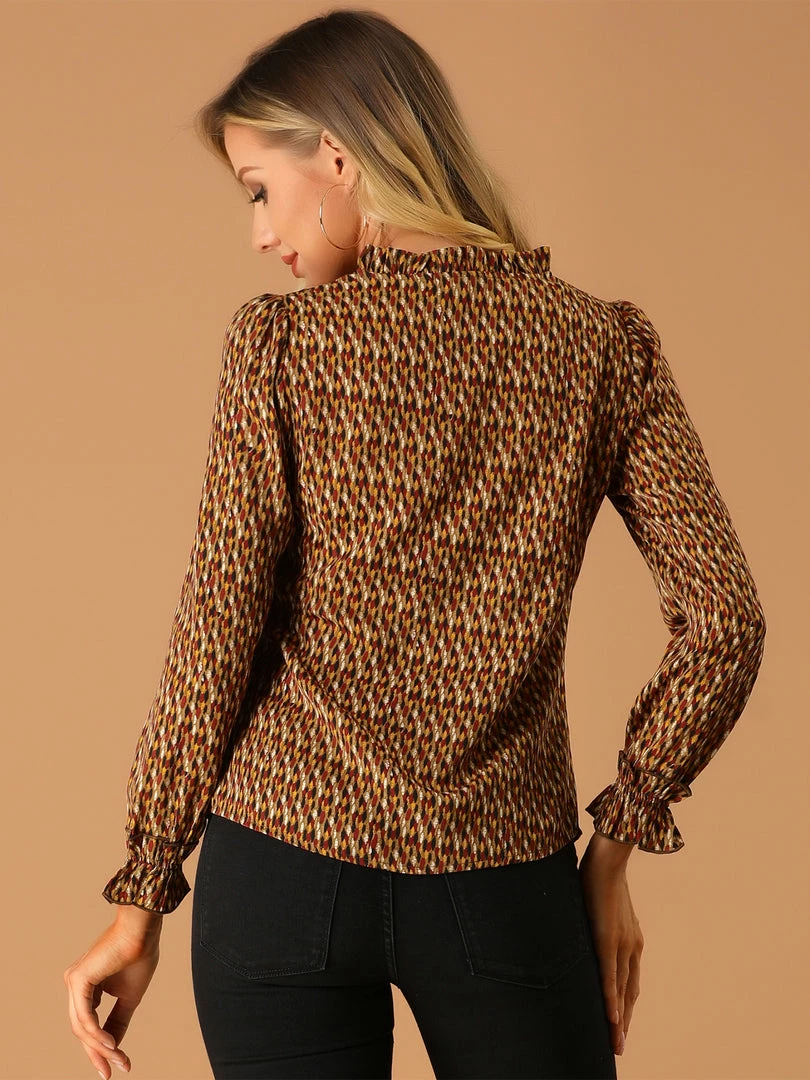 • Dainty geometric dots printed pattern and ruffled detailing help create the sophisticated design, while puffed sleeves lend an elegant finishing touch on this vintage V-neck shirt.