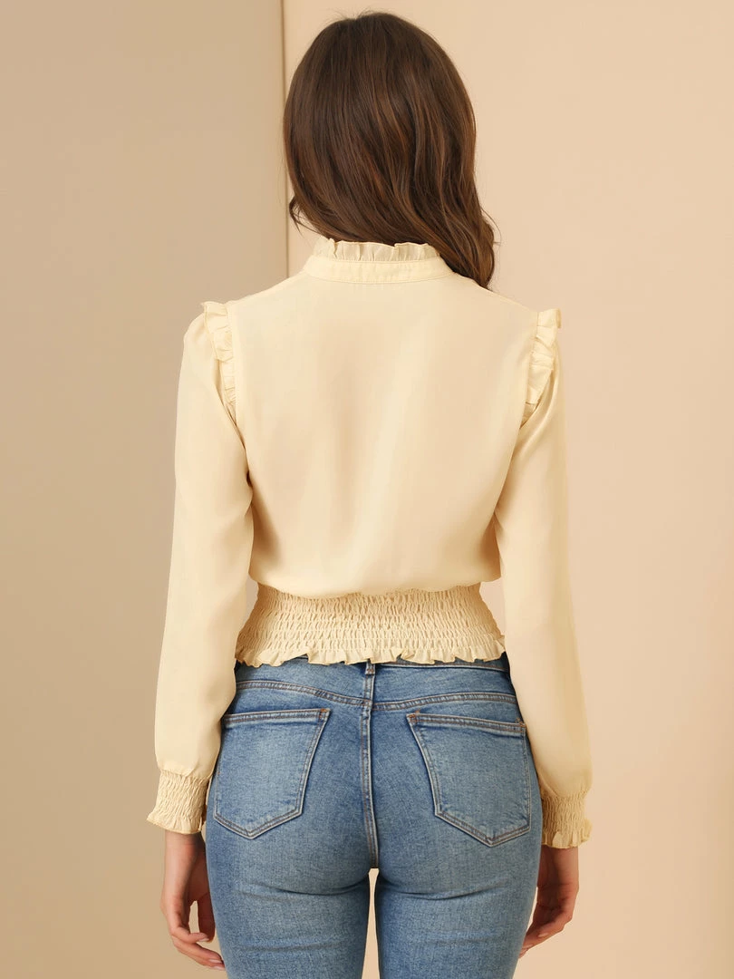 Women’s Ruffle V Neck Chiffon Long Sleeve Smocked Waist Top