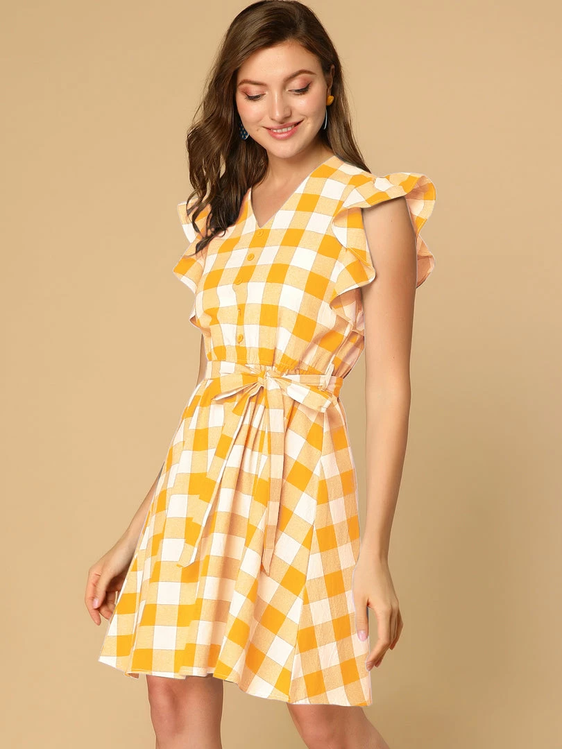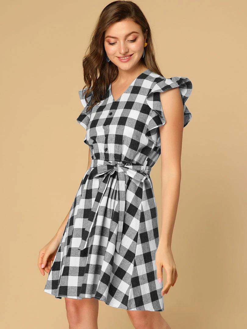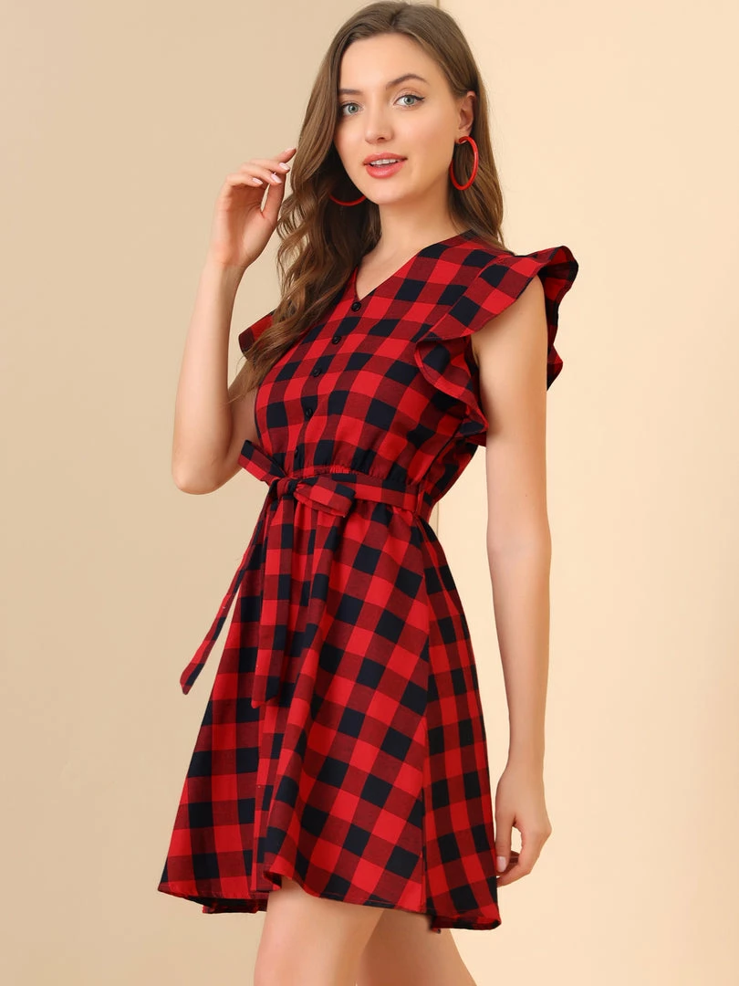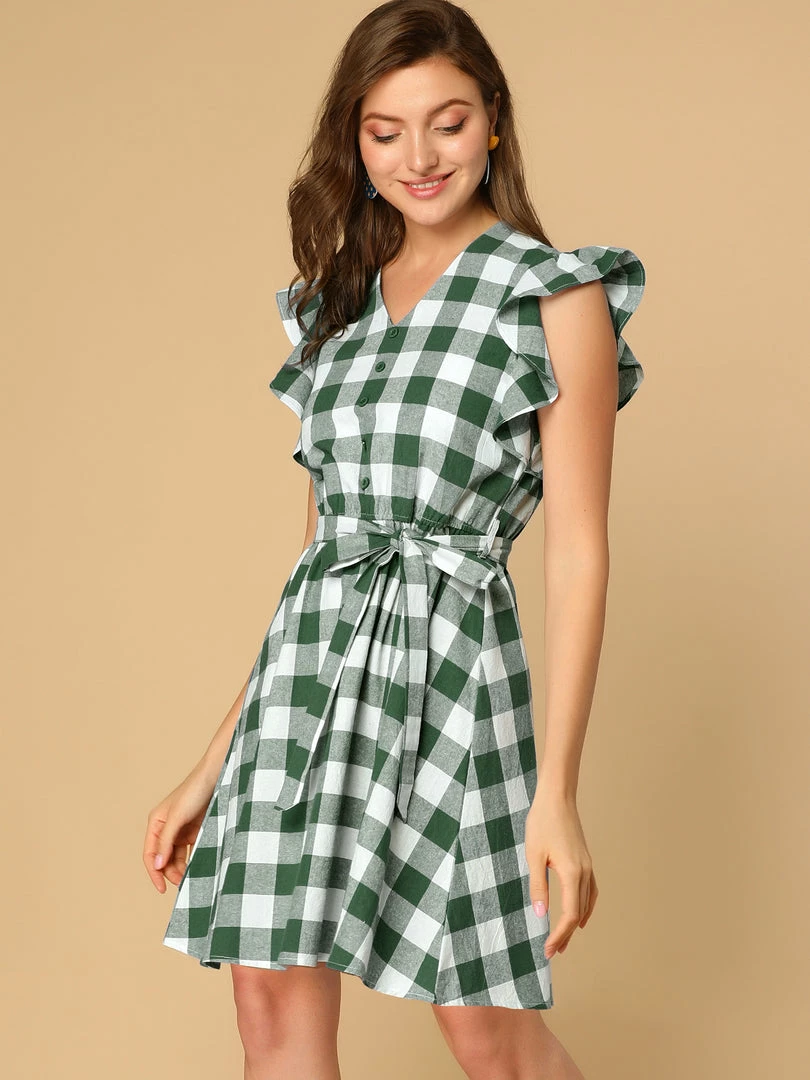 Allegra K Women’s Ruffled Sleeve Belted Vintage Check Plaids Dress