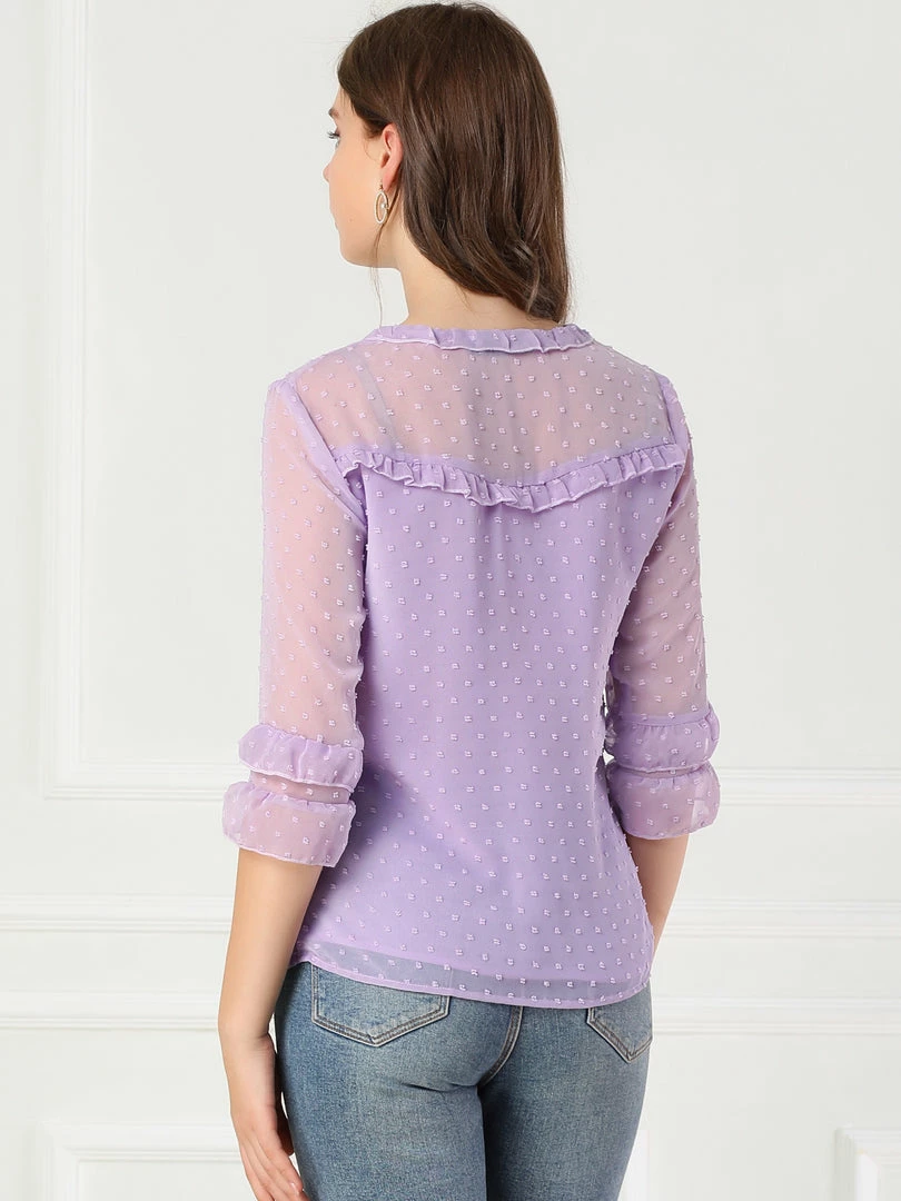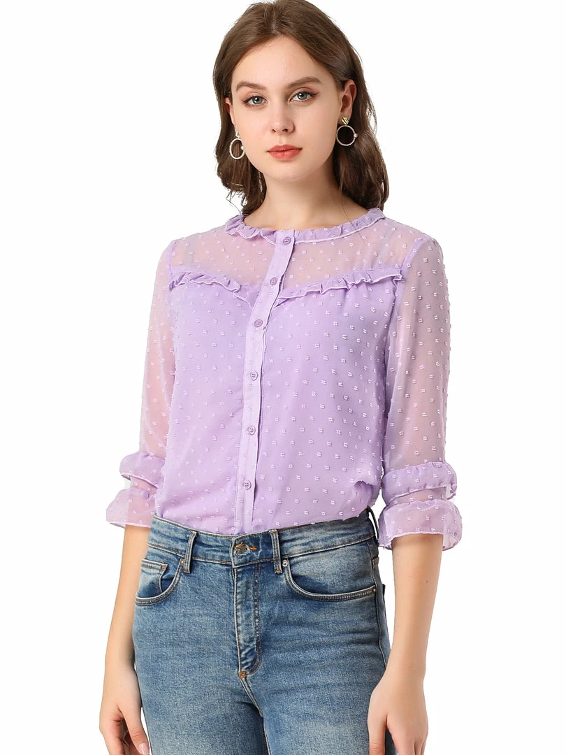 Allegra K Women’s Ruffled Sleeve Frill Trim Button Down Semi-Sheer Swiss Dots Blouse