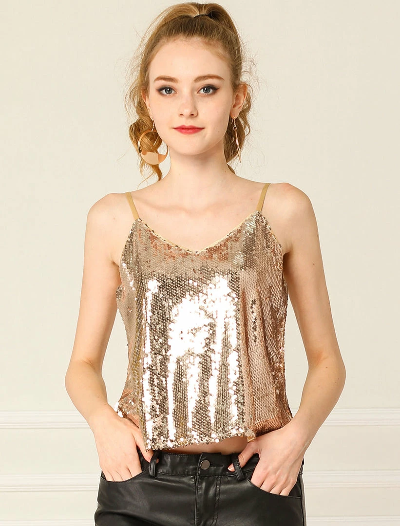 Allegra K Women’s Sequin Sparkle Glitter Spaghetti Strap Crop Camisole Tank Top