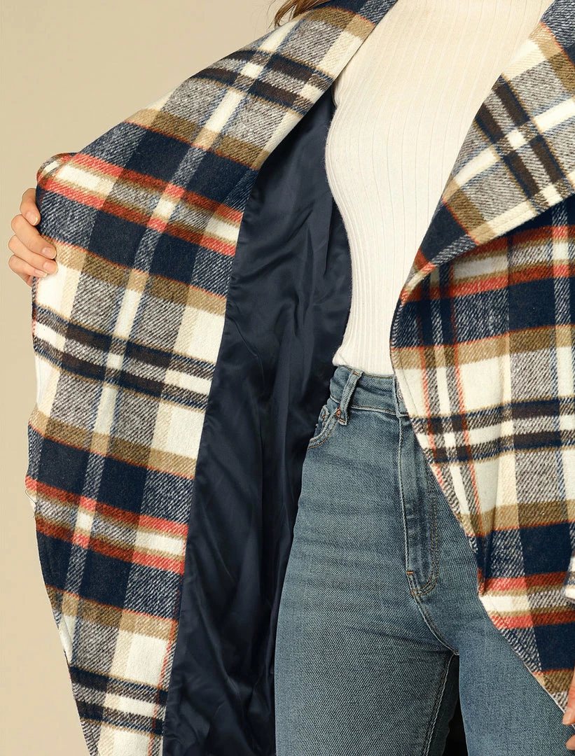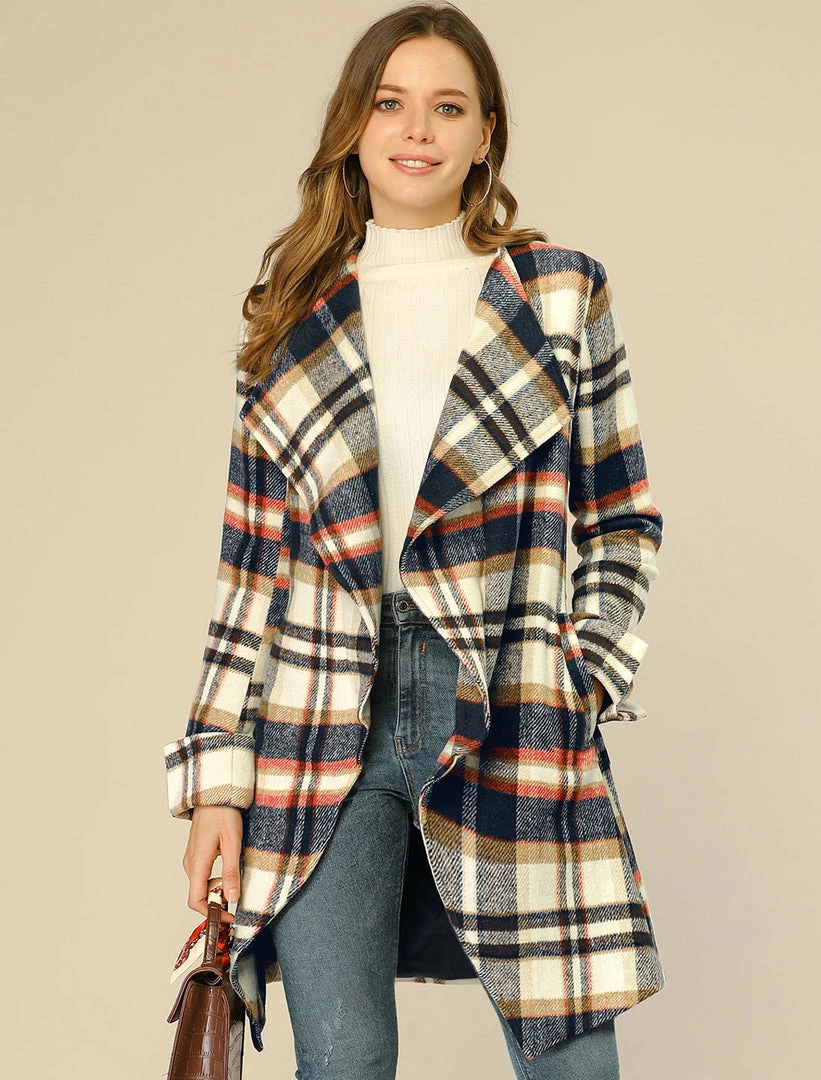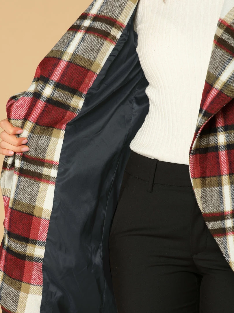 • The shawl lapel collar and wrap design with belt help create the sophisticated timeless brown plaid coat for this winter.
