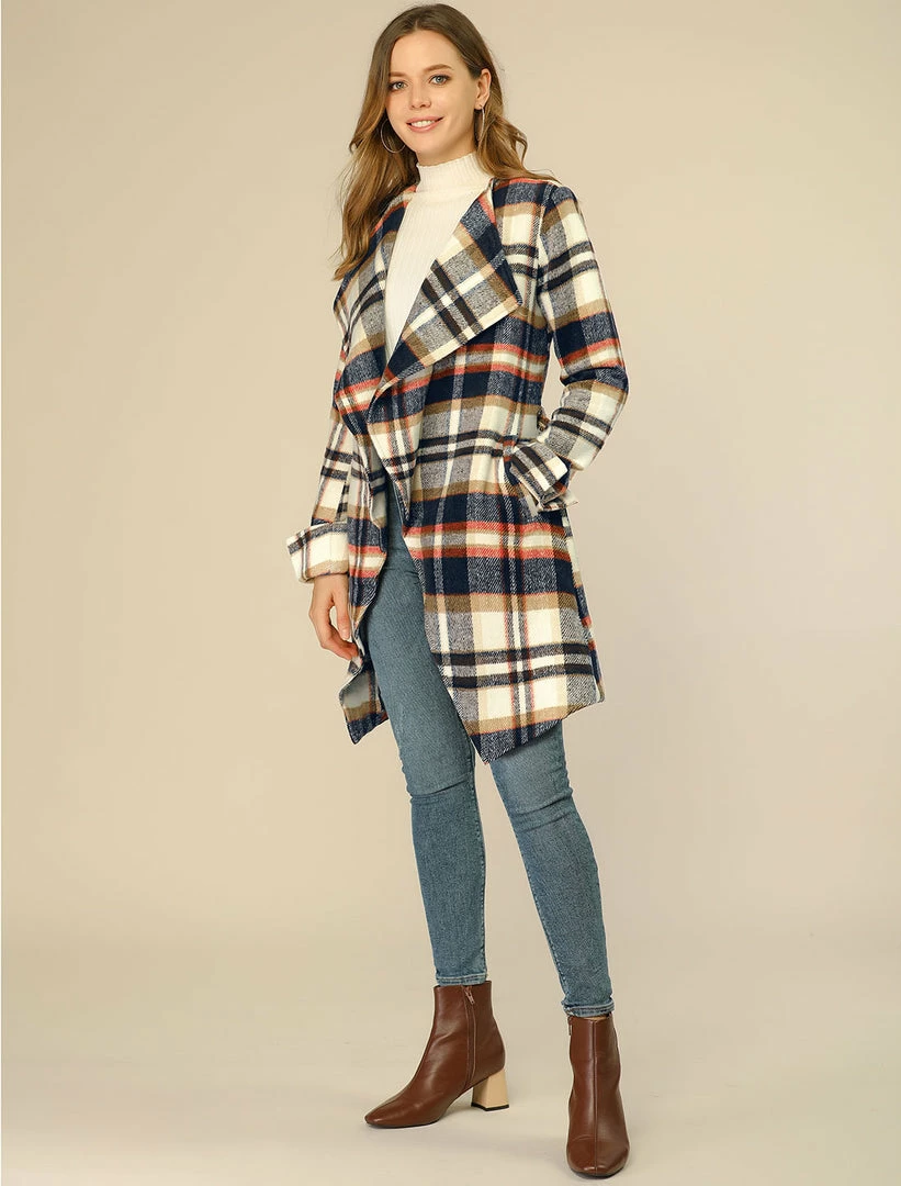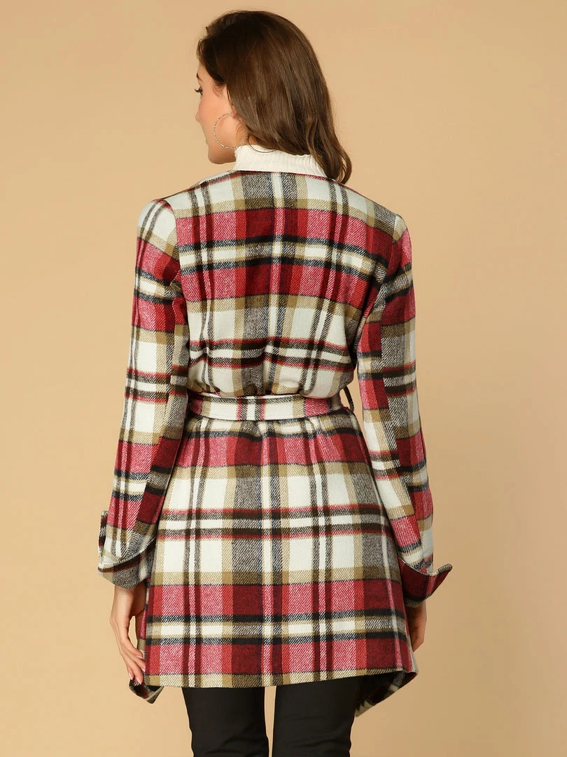 Allegra K Women’s Shawl Collar Belted Asymmetrical Hem Plaid Coat