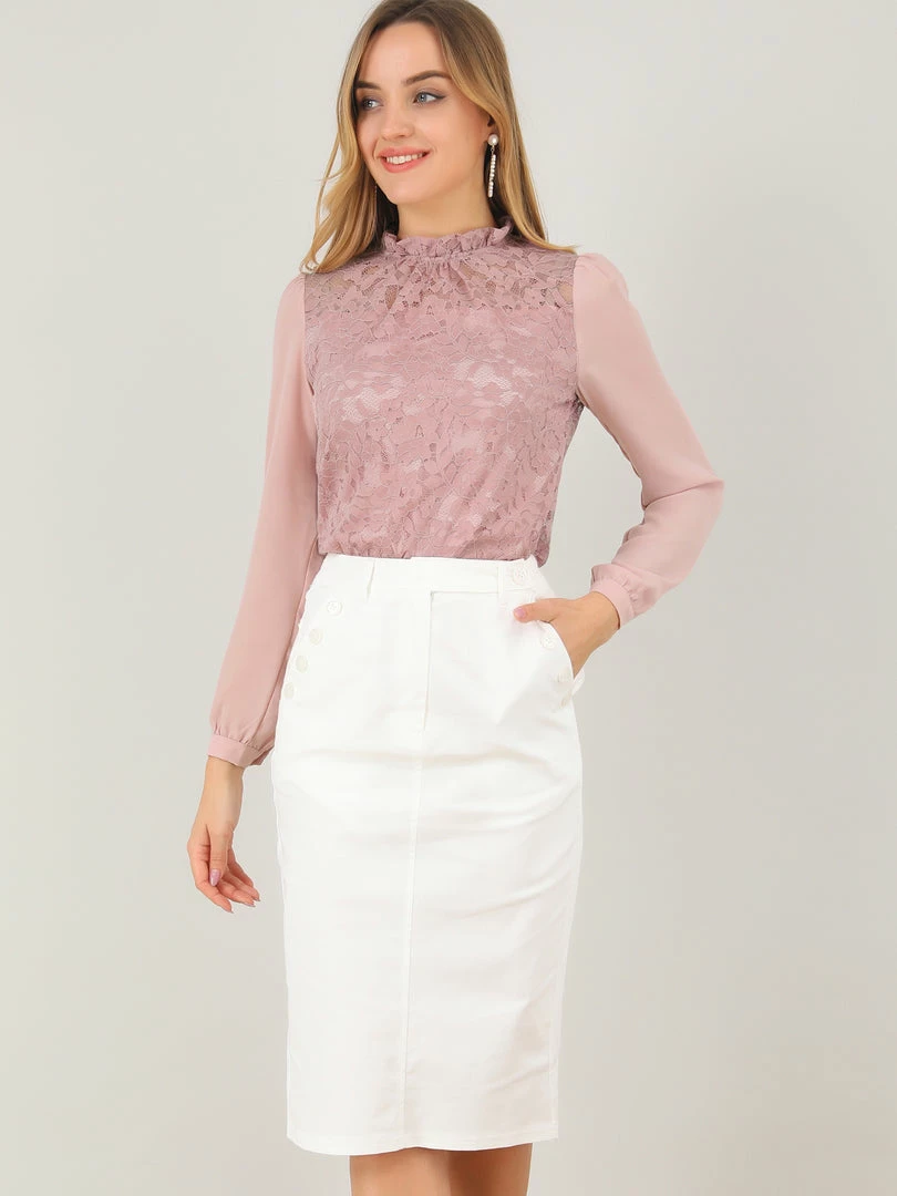 Allegra K Women’s Sheer Long Sleeves Ruffle Neck Flower Embroidery Lace Top