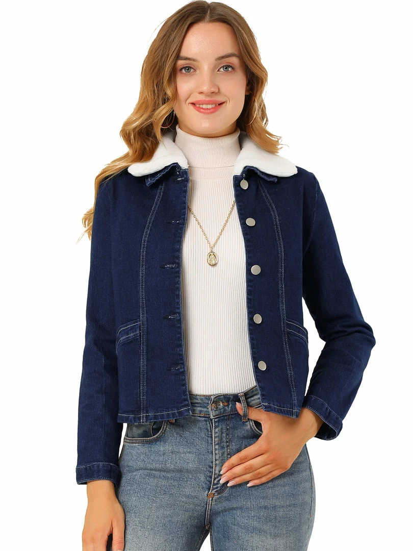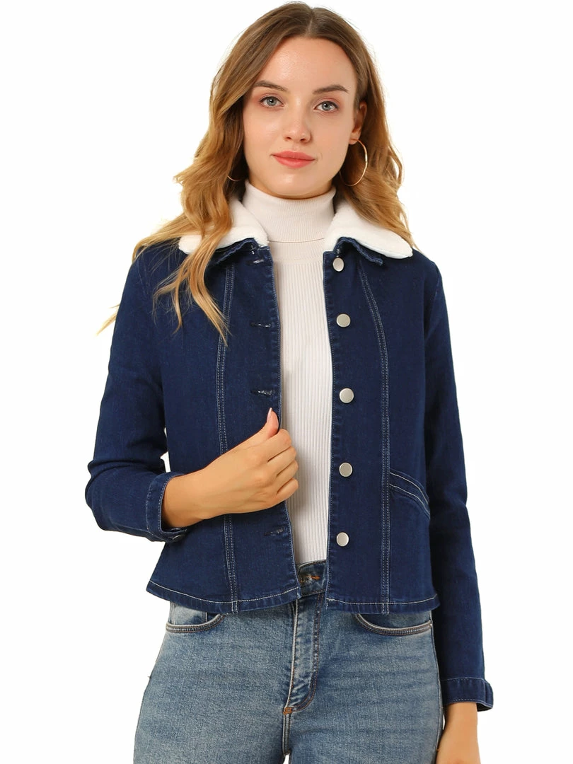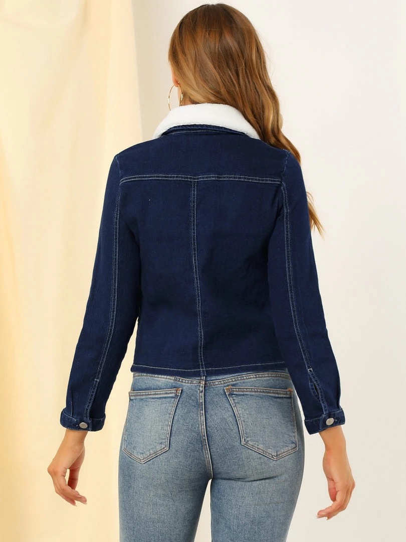 Allegra K Women’s Sherpa Collar Button Down Long Sleeve Casual Stretch Denim Jacket