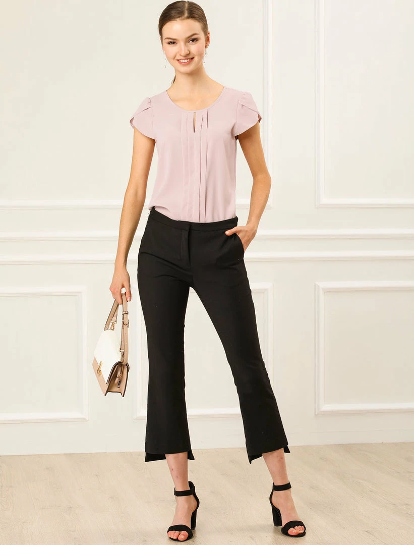 Allegra K Women’s Short Sleeve Pleated Front Office Round Neck Chiffon Keyhole Tops