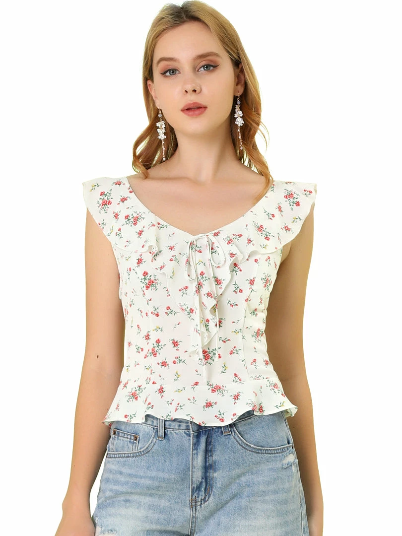 Allegra K Women’s Sleeveless Bow Tie Scoop Neck Ruffle Cropped Floral Top