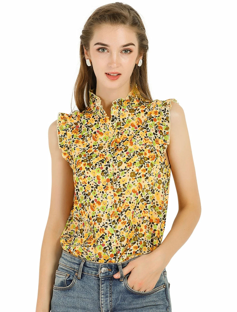 Allegra K Women’s Sleeveless Ruffle Neckline Button Down Floral Top