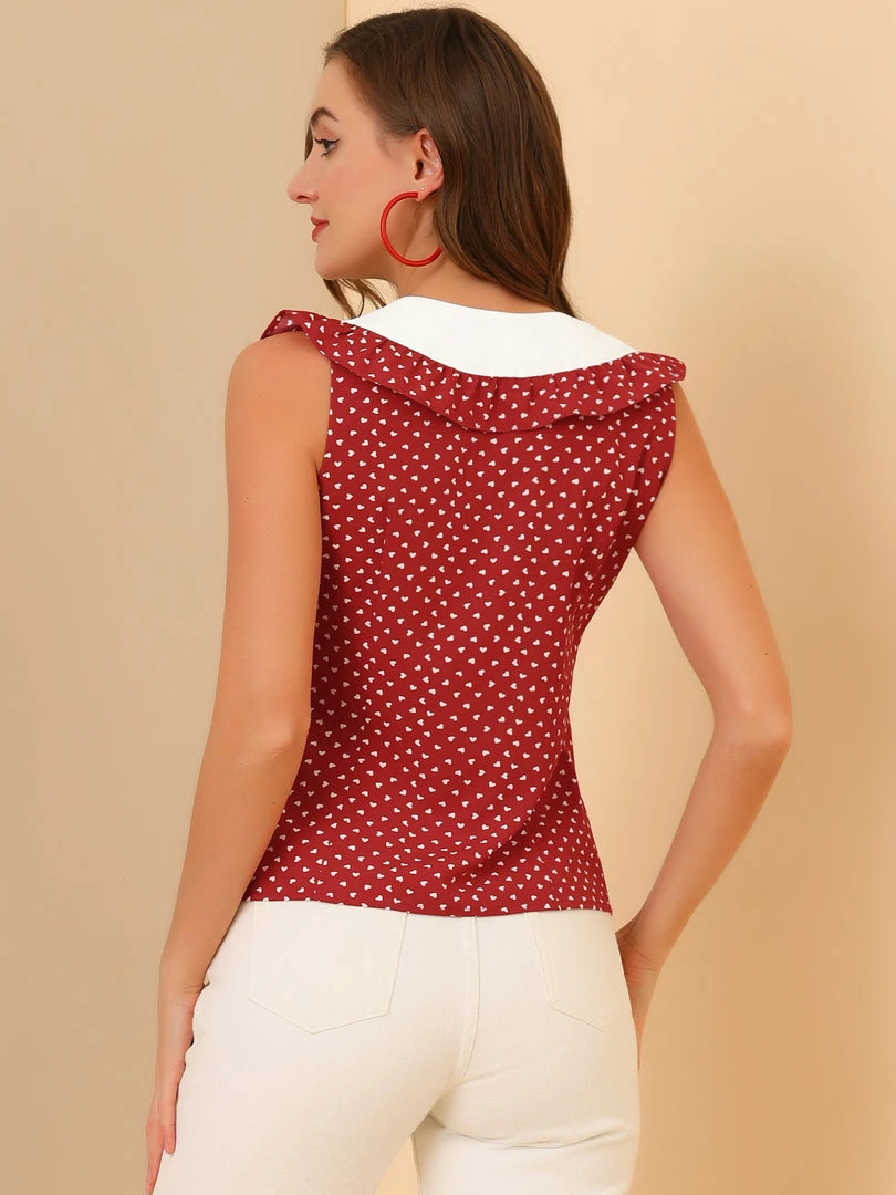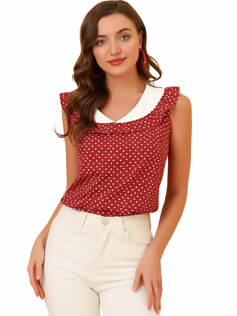 Women’s Tops Ruffle V Neckline Heart Print Sleeveless Summer Blouse