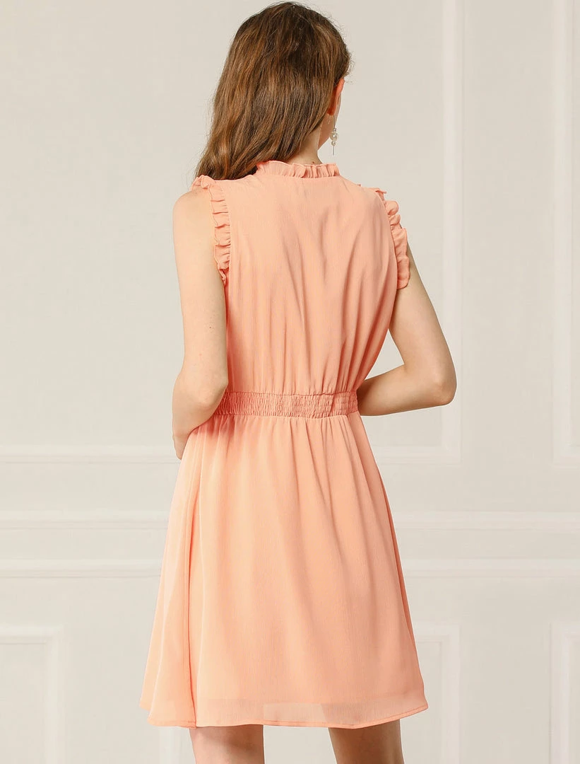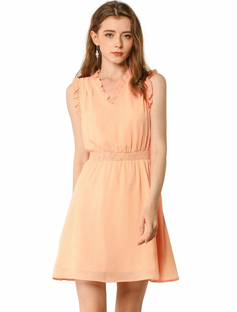 Allegra K Women’s Sleeveless Ruffle V Neck Chiffon Smocked Waist A-Line Dress