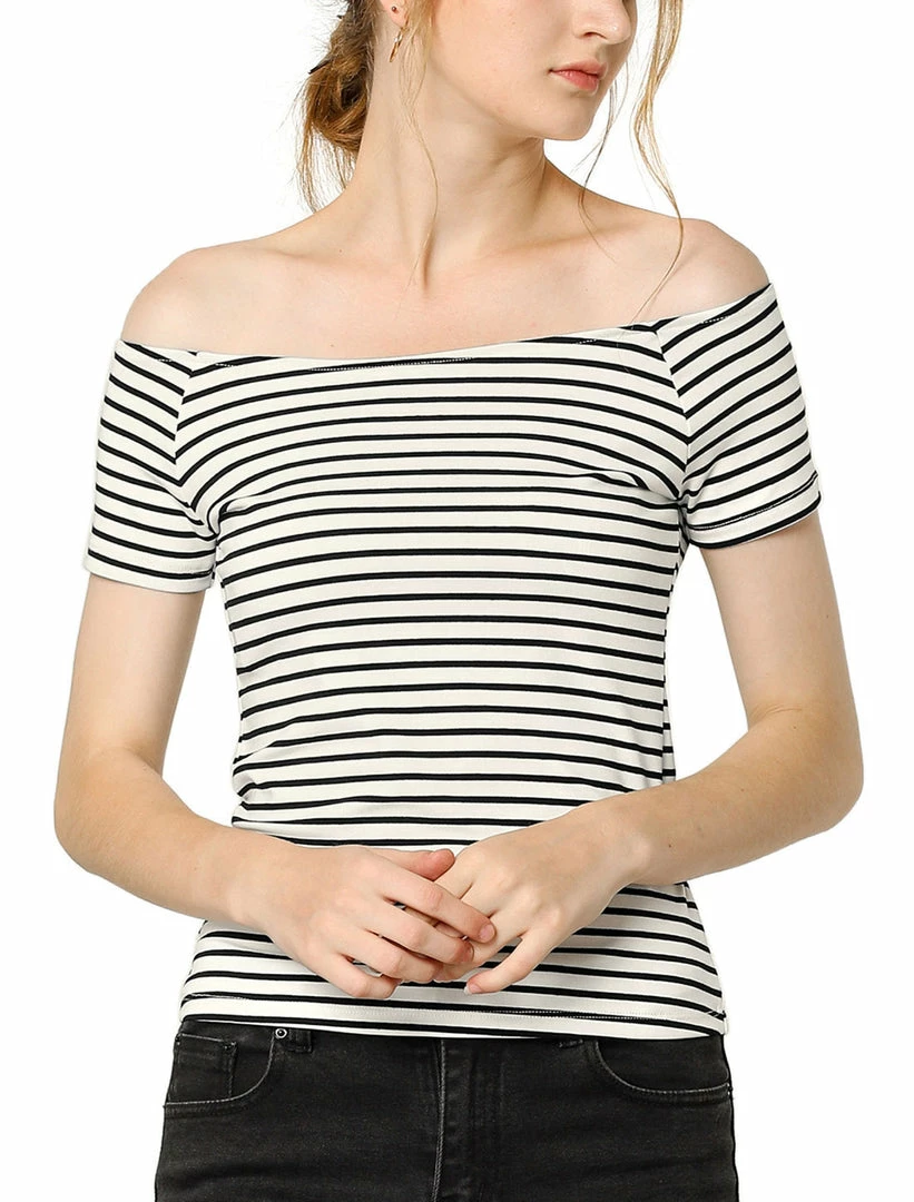 Allegra K Women’s Slim Fit Short Sleeves Off The Shoulder Cropped Top