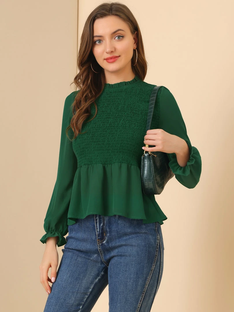 - Ruffle Mock Neck, Puff Long Sleeve, Elastic Cuff, High Waist, Chiffon, Smocked Peplum Tops, Unlined.