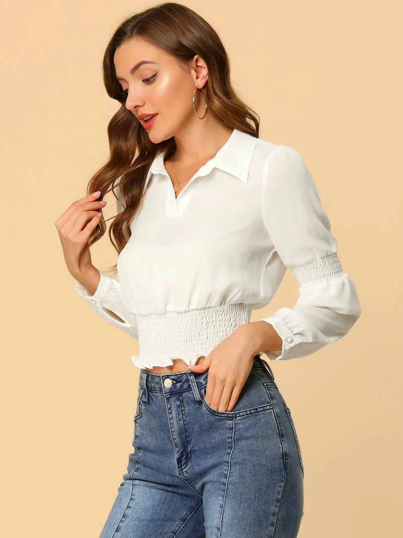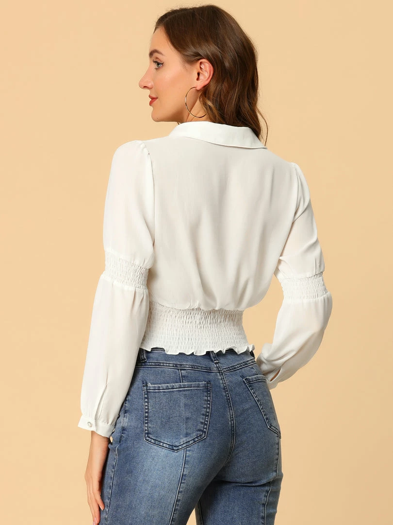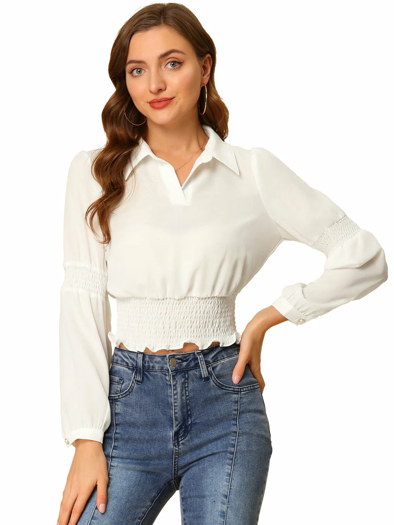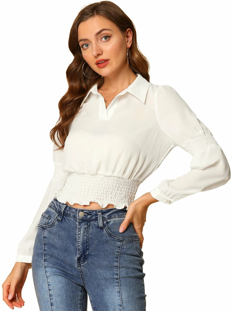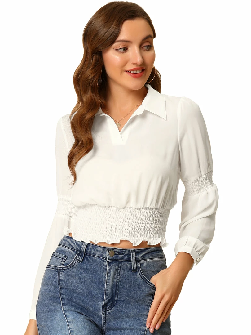 Allegra K Women’s Smocked Crop Top Sheer Mesh Long Sleeve Point Collar Chiffon Blouse