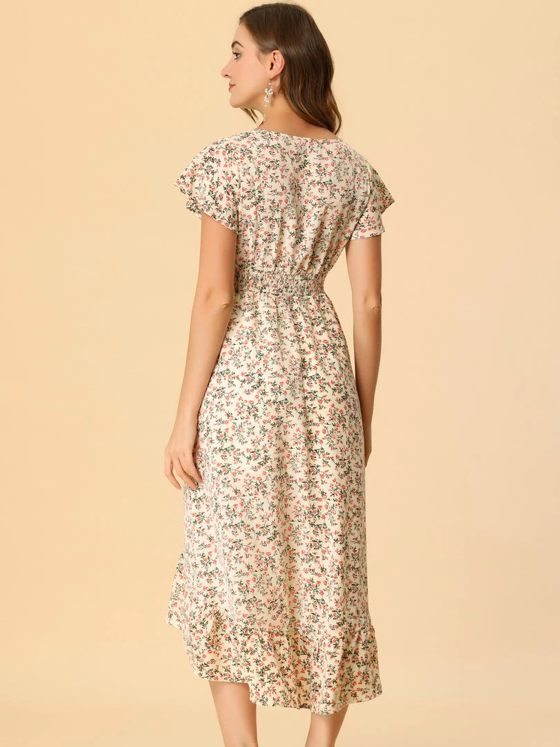 •Features: Floral printed, v-neck, short sleeve, waist smocked, high low flowy dress