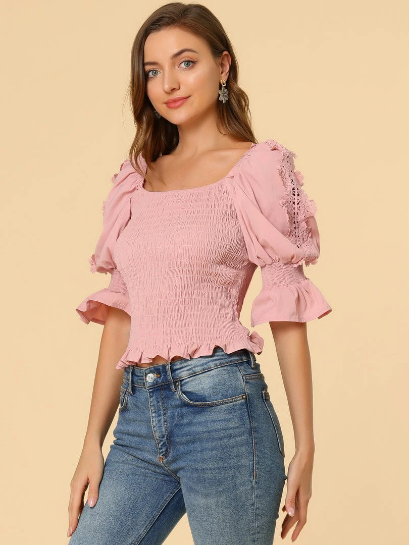 Allegra K Women’s Smocked Blouse Square Neck Ruffle Sleeves Lace Trim Top