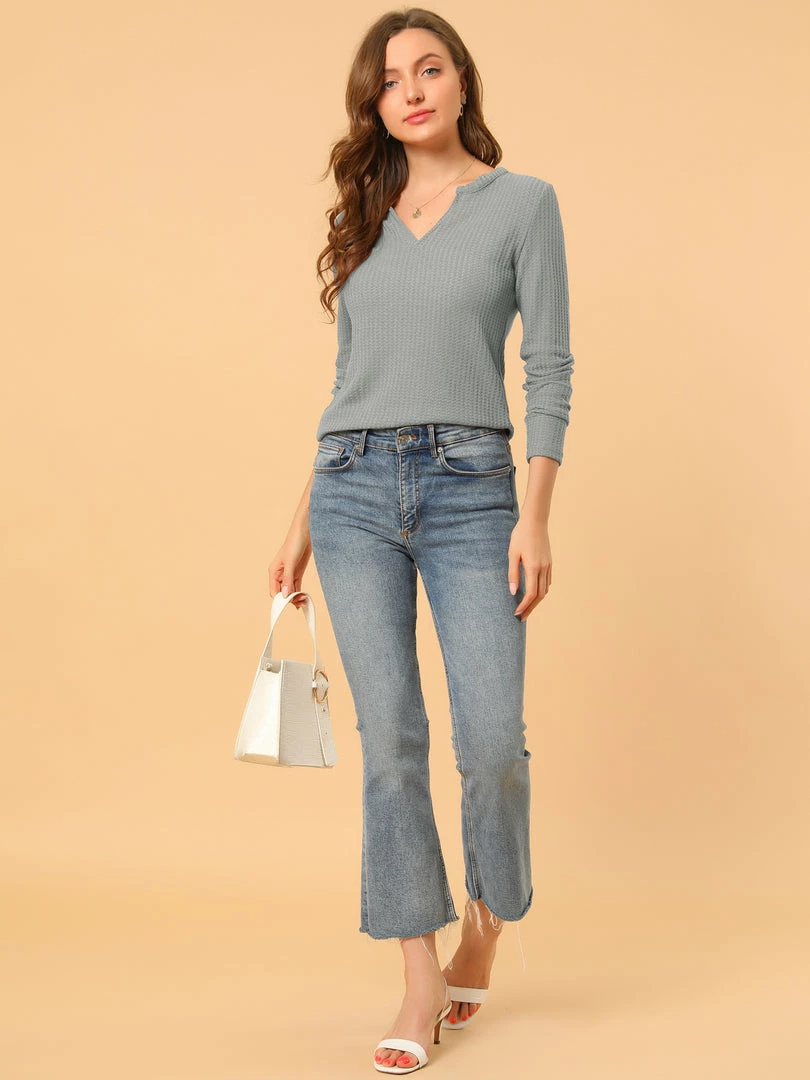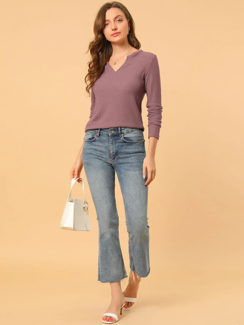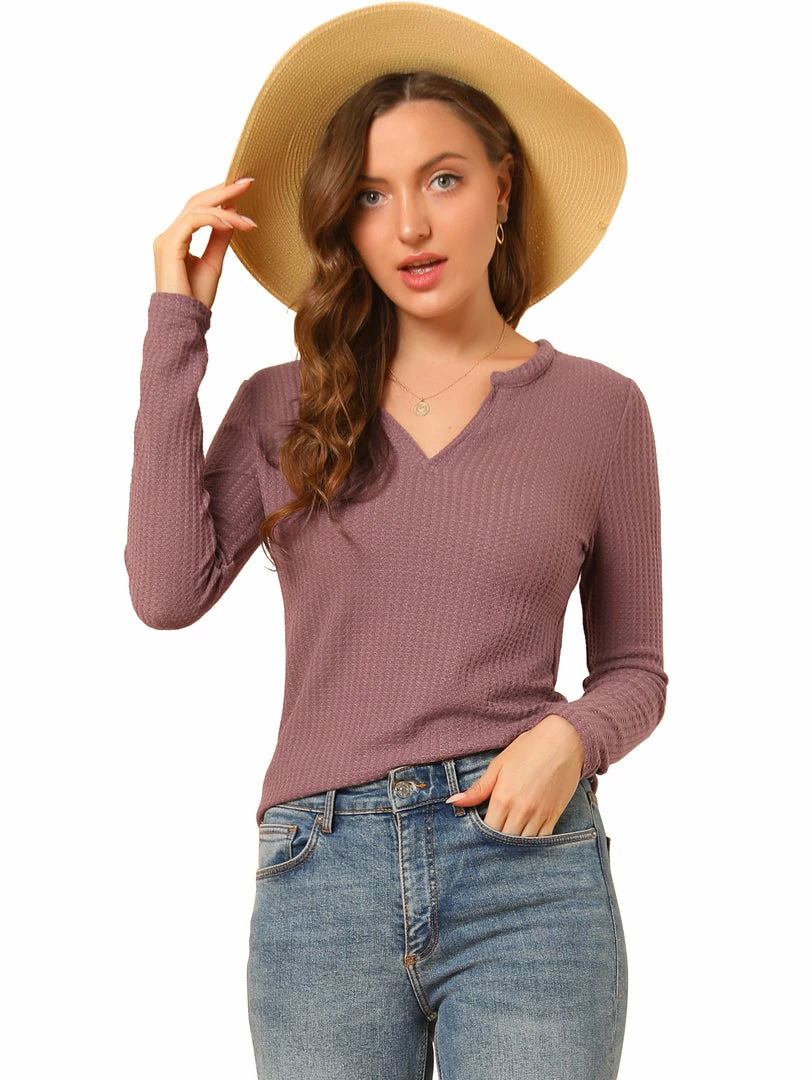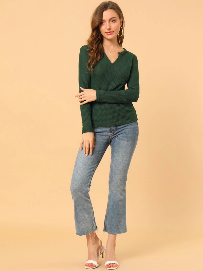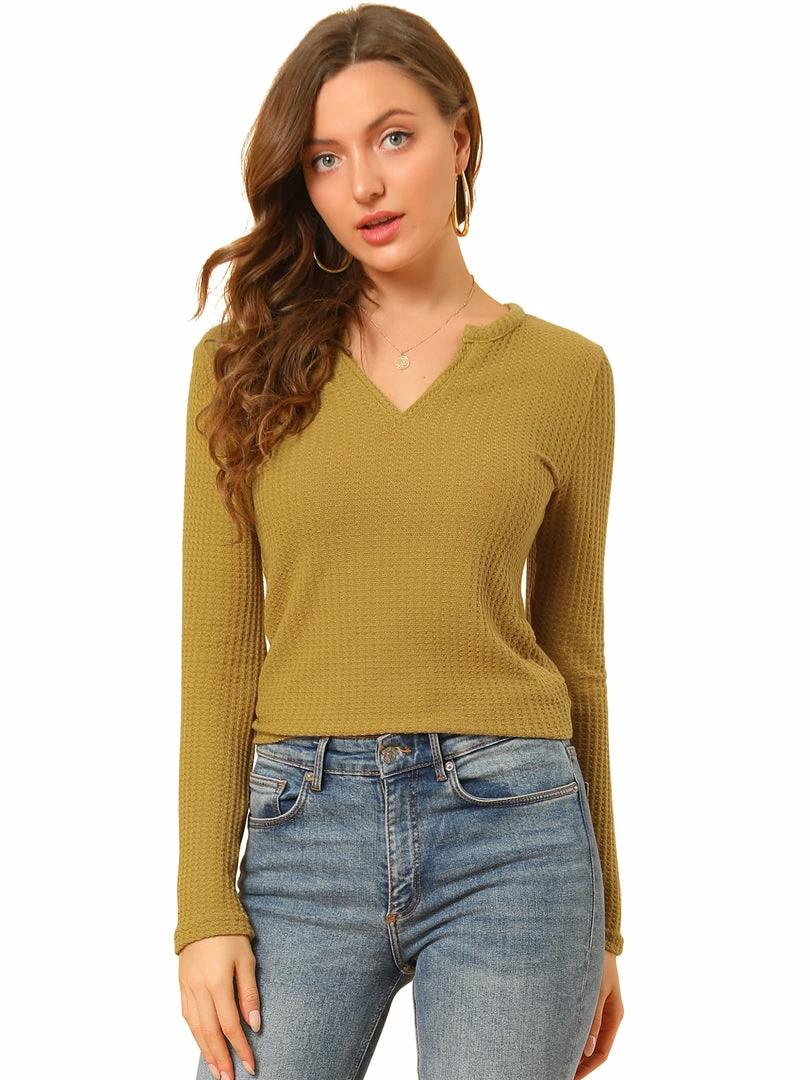 Allegra K Women’s Solid Color Waffle Knit Long Sleeve V Neck Pullover Sweaters