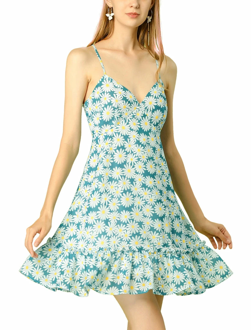 Allegra K Women’s Spaghetti Straps V-Neck Sundress Sleeveless Floral Summer Dress