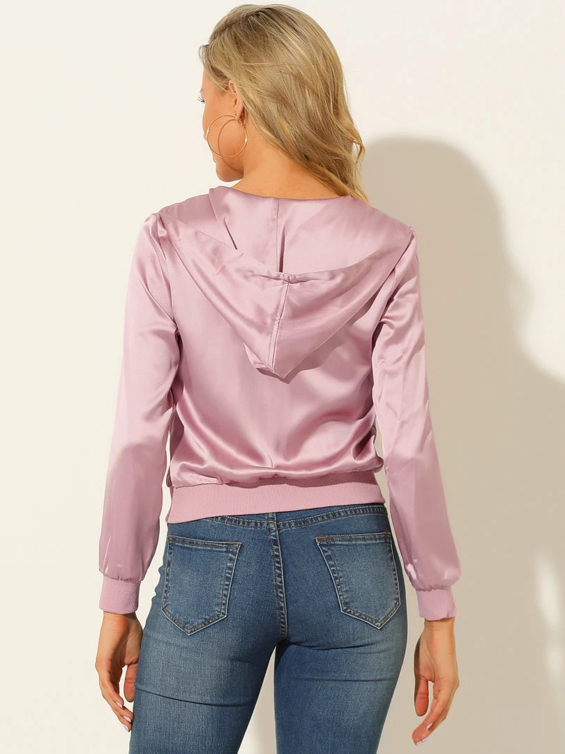 Allegra K Women’s Sparkle Holographic Shimmering Metallic Zipper Front Hood Shiny Bomber Jacket
