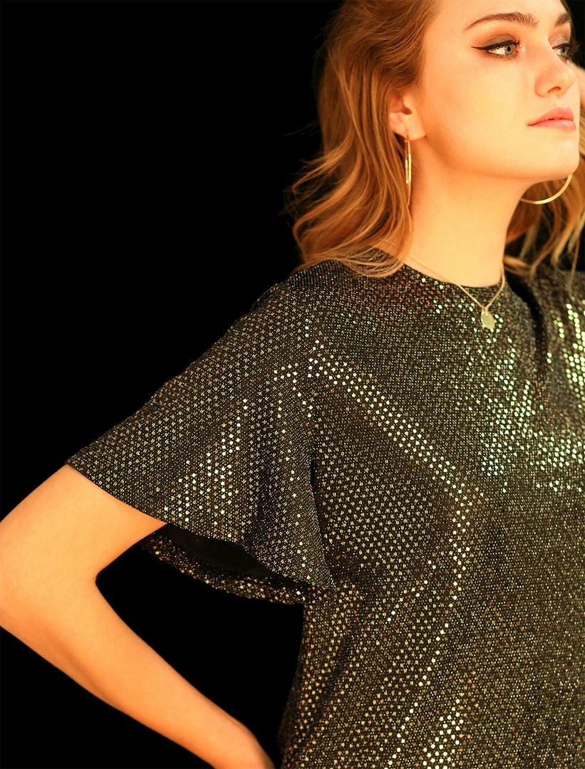 - In a straight silhouette, the relaxed fit piece is made from a stretchy metallic fabric, has a crew-neck with short fluttering sleeves.