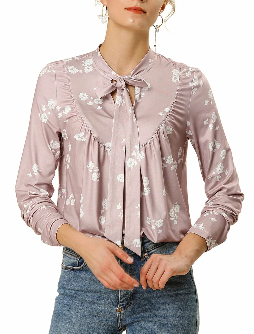 • Loose Fit, Bow Tie Neck, Floral Print, Stretchy Fabric, Pleated Front, Long Sleeve with Button Cuffs, Unlined.