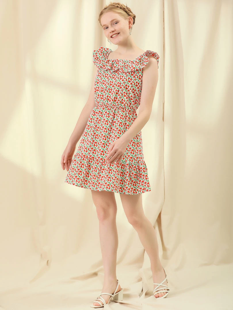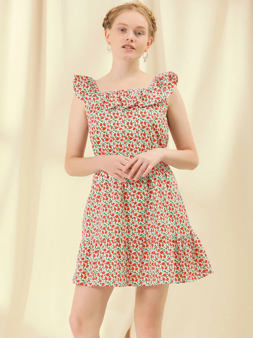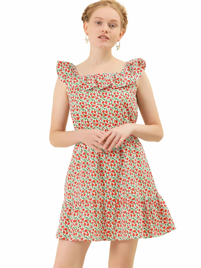 Allegra K Women’s Square Neck Cotton Dress Ruffle Fruits Print Summer Sleeveless Dress