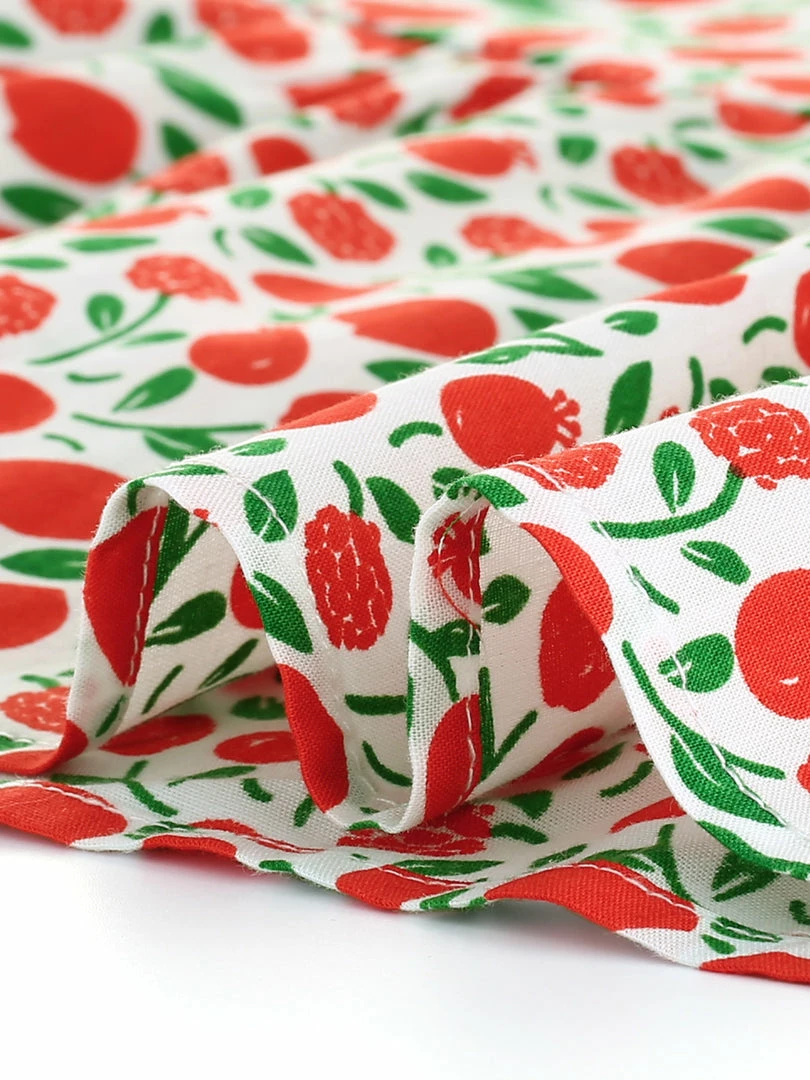 • Cotton fabric, covered in a red and green fruit print, creates a U neck and ruffles, fitted waist that falls to an A-line silhouette.