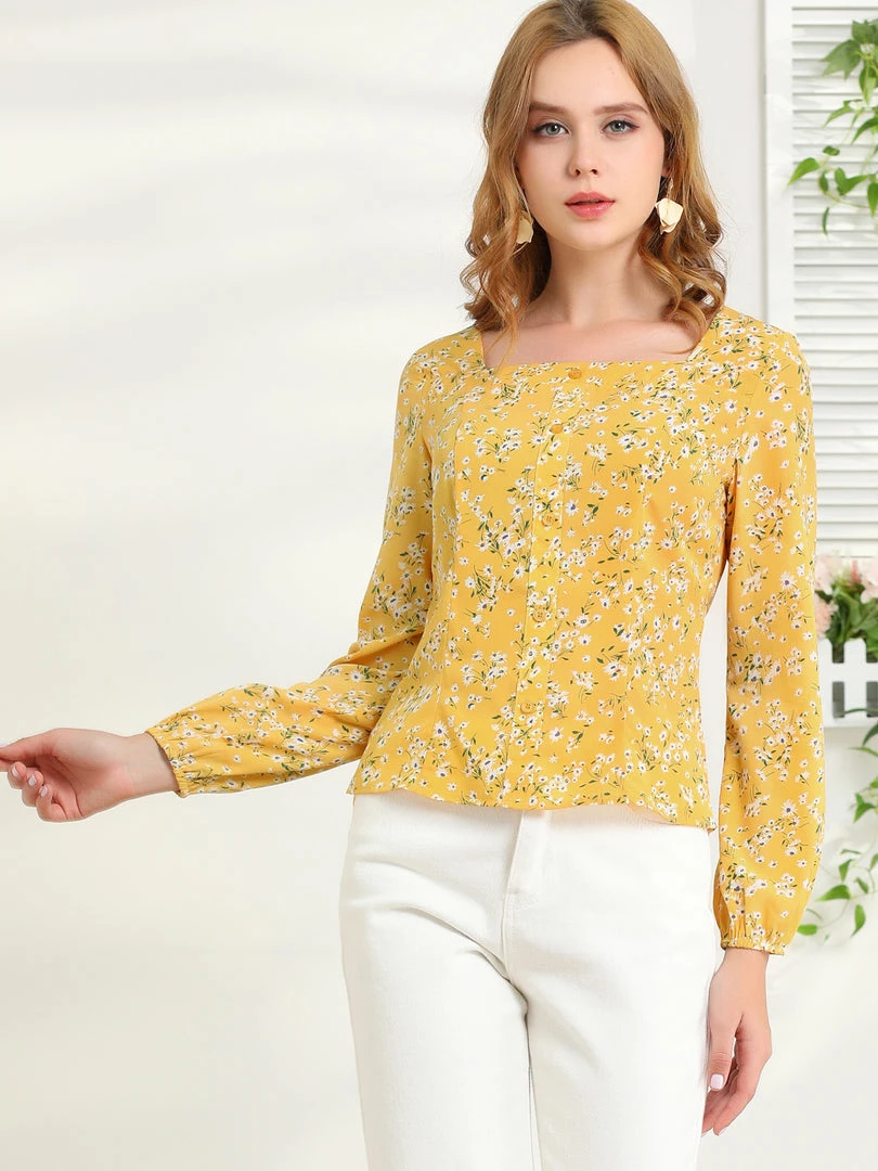 Allegra K Women’s Square Neck Elegant Vintage Floral Long Sleeves Tops