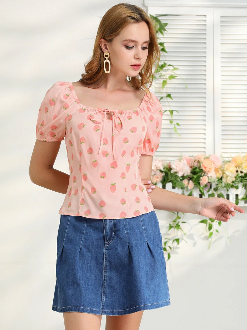 Allegra K Women’s Square Neck Tie Fruit Bubble Sleeve Summer Crop Vintage Blouse