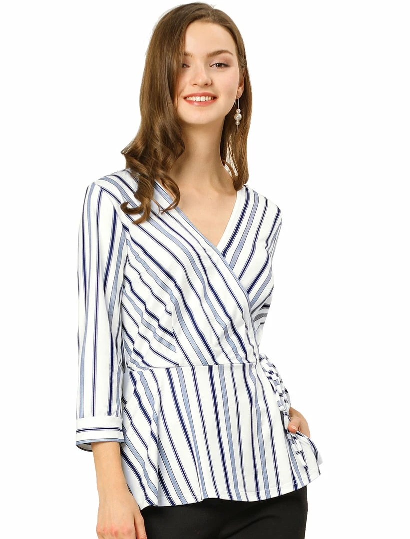 Allegra K Women’s Striped Work 3/4 Sleeves V Neck Peplum Top