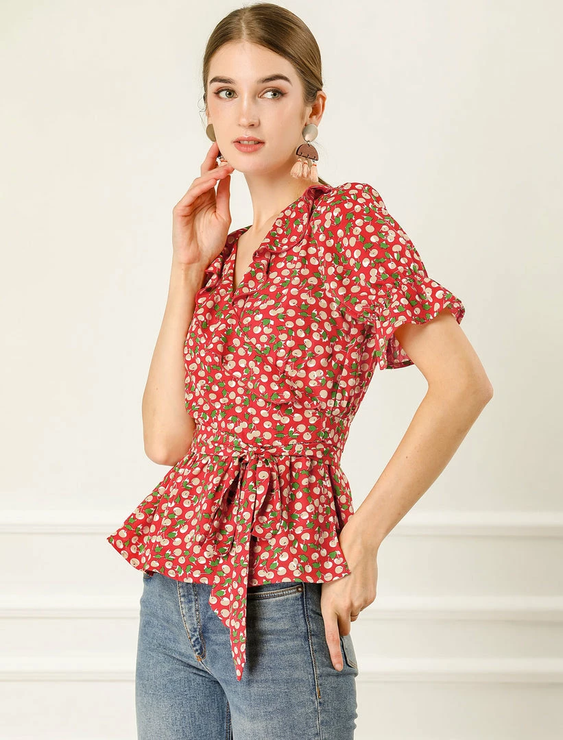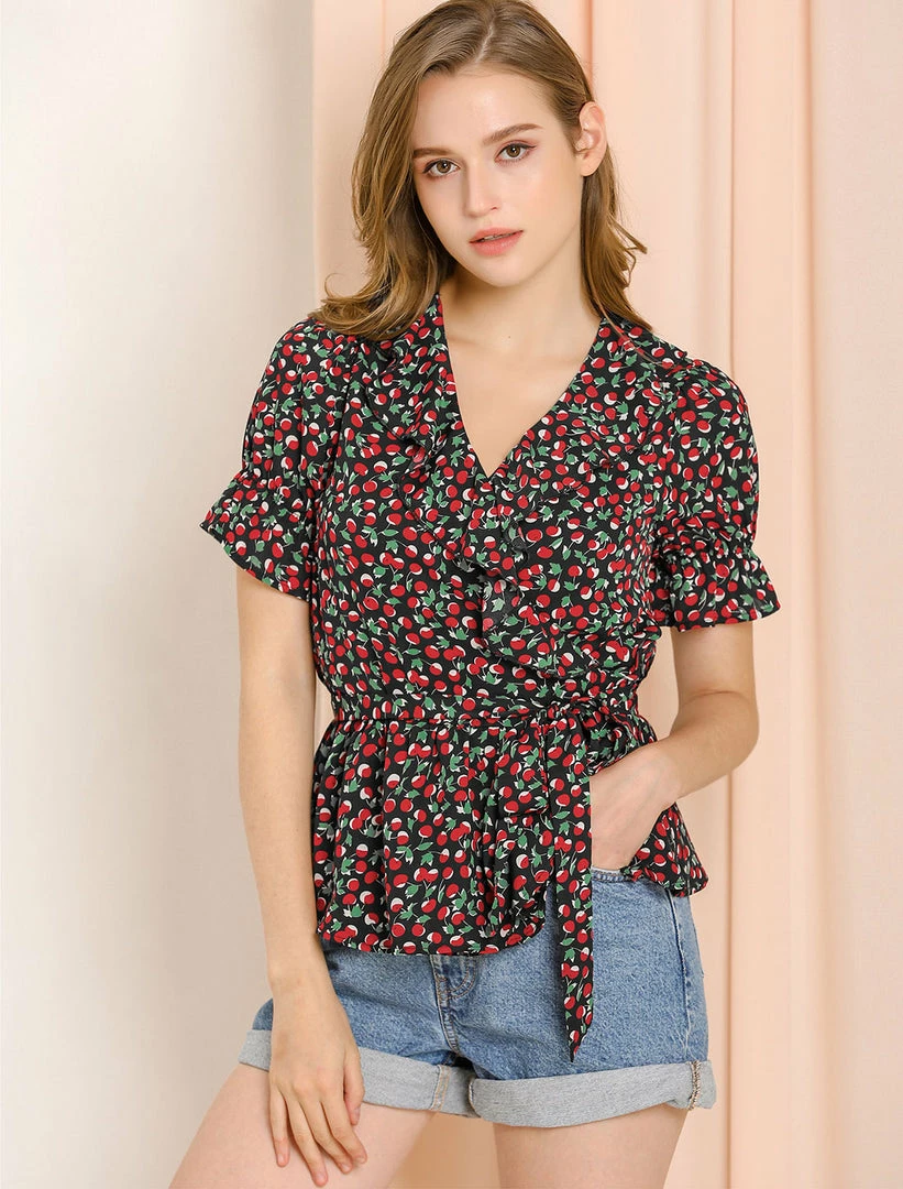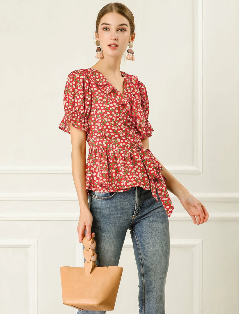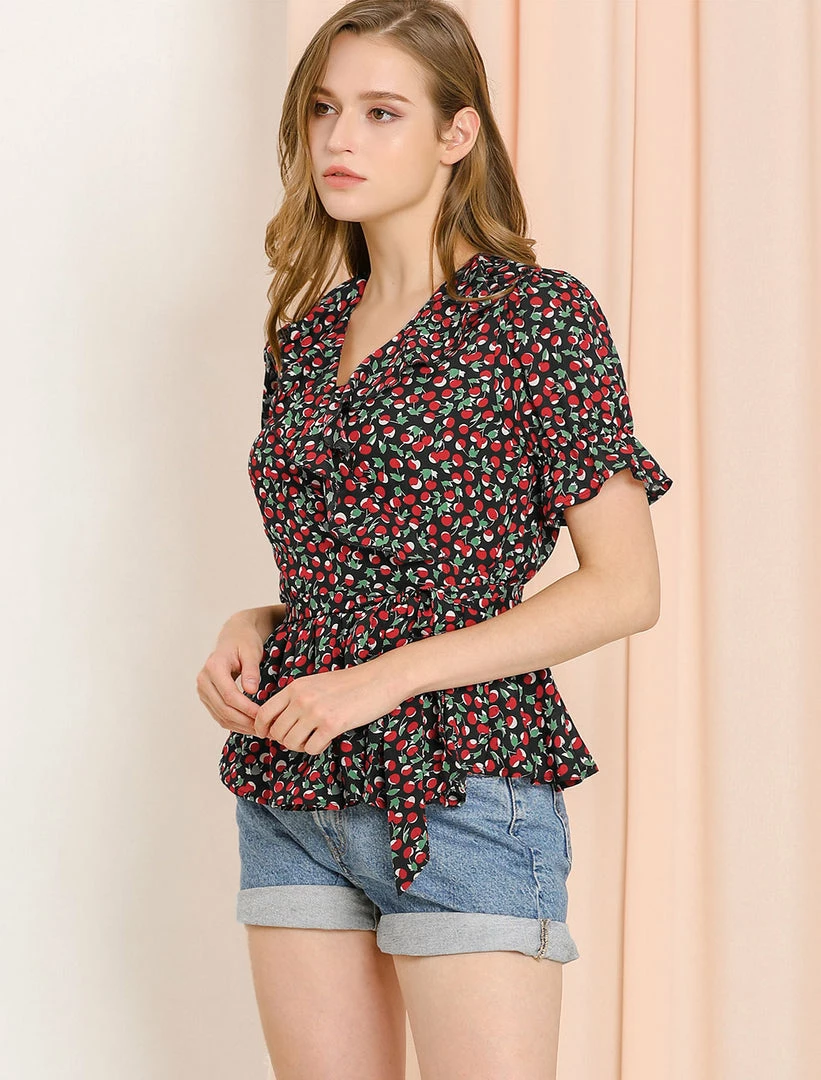 Allegra K Women’s Sweet Fruit Crossover V Neck Ruffle Wrap Blouse Top
