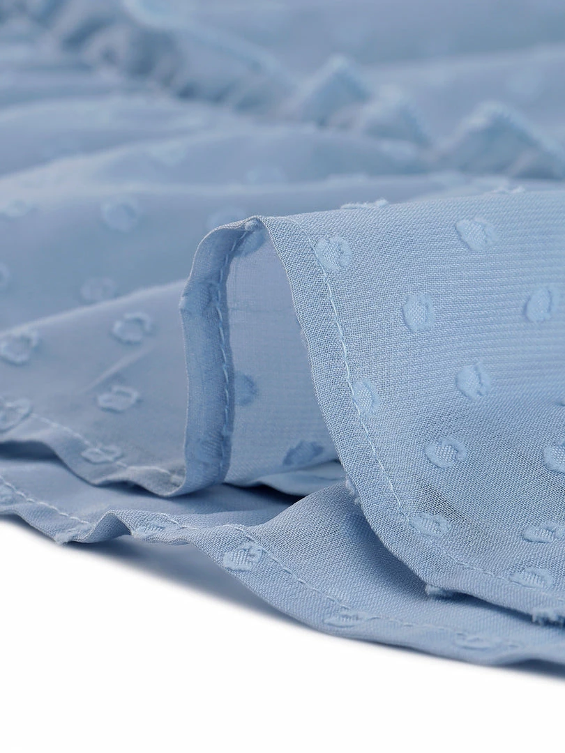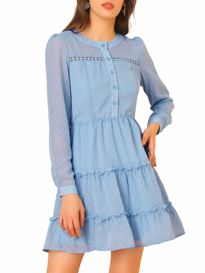- Cute flowy dress with swiss dots decoration, button cuff, and band collar, creating a feminine atmosphere for ladies.