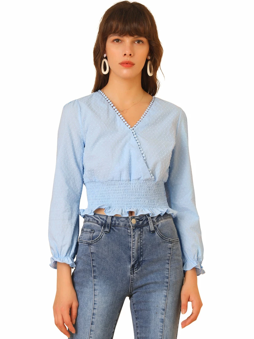 Allegra K Women’s Swiss Dots Ruffle Long Sleeve V Neck Smocked Wrap Crop Top